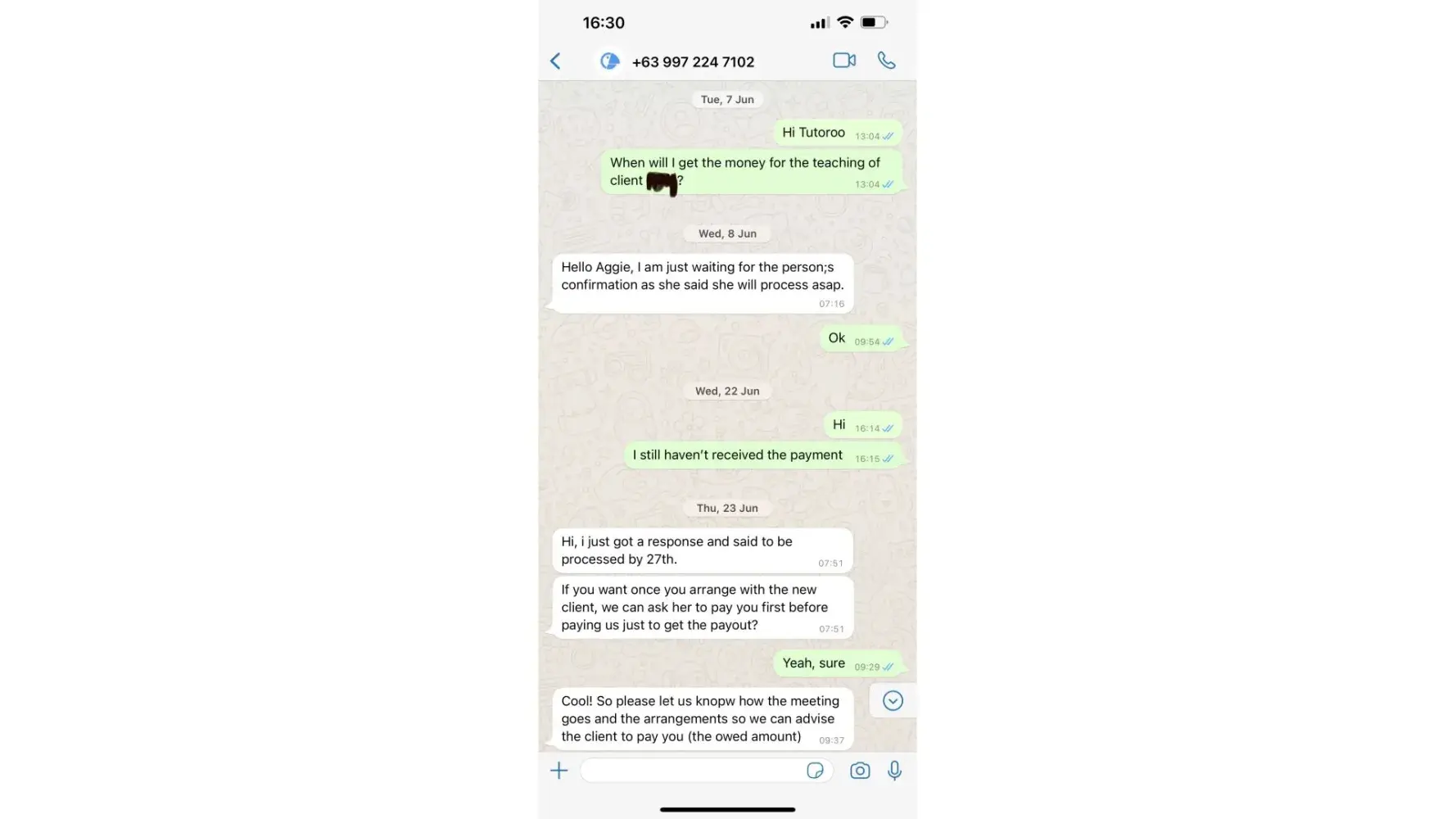 this happened on 1st June 2022, still until today 18th July 2022, I haven't received payment. Totutoo just keeps saying that the girl supposed to pay me is going to transfer the money to me soon, or Tutoroo says the girl has processed the payment but maybe there is a problem, she needs to check with the bank. I asked what if the girl she will never transfer, shall I wait for her forever? Tutoroo said that they will follow up, and there is no deadline. I asked for other means to pay me, they say they can not, because the payment is in process.