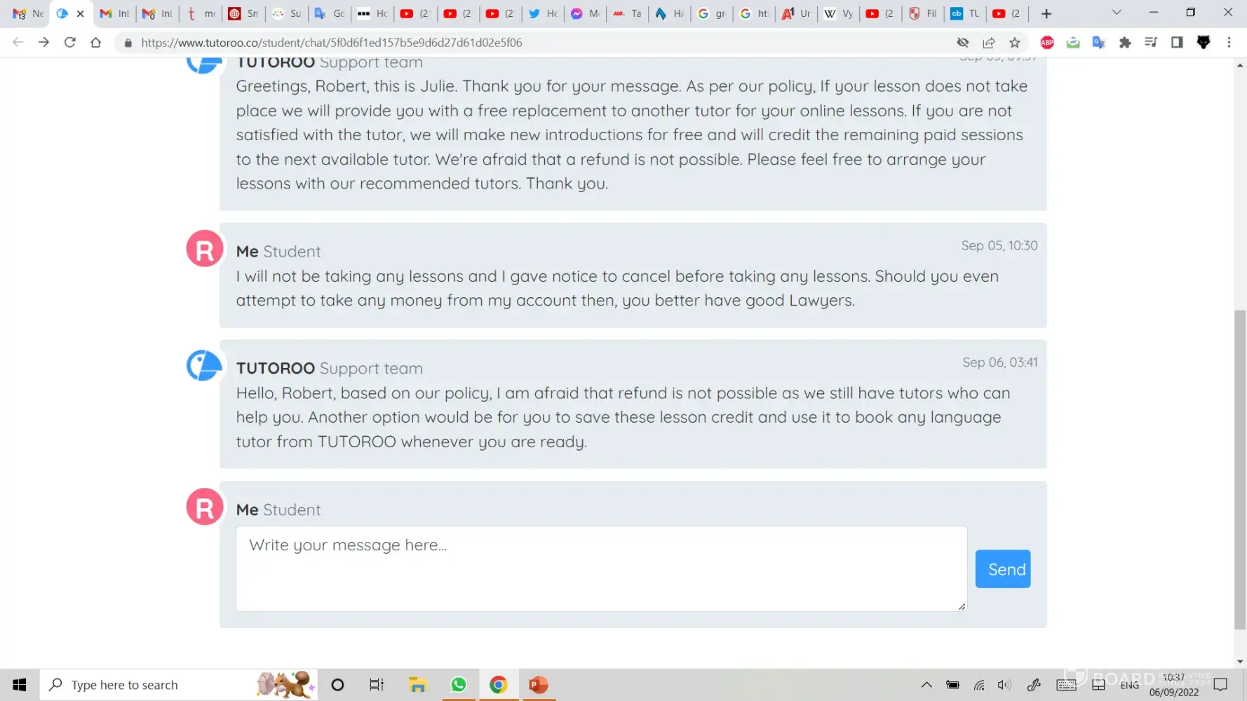 Due to not being able to achieve any of my specific requests and understanding that I was not getting any support on a Sunday, I wrote to Tutoroo that evening informing them of my wish to cancel any agreement for tuition and that they should refund any monies withdrawn.