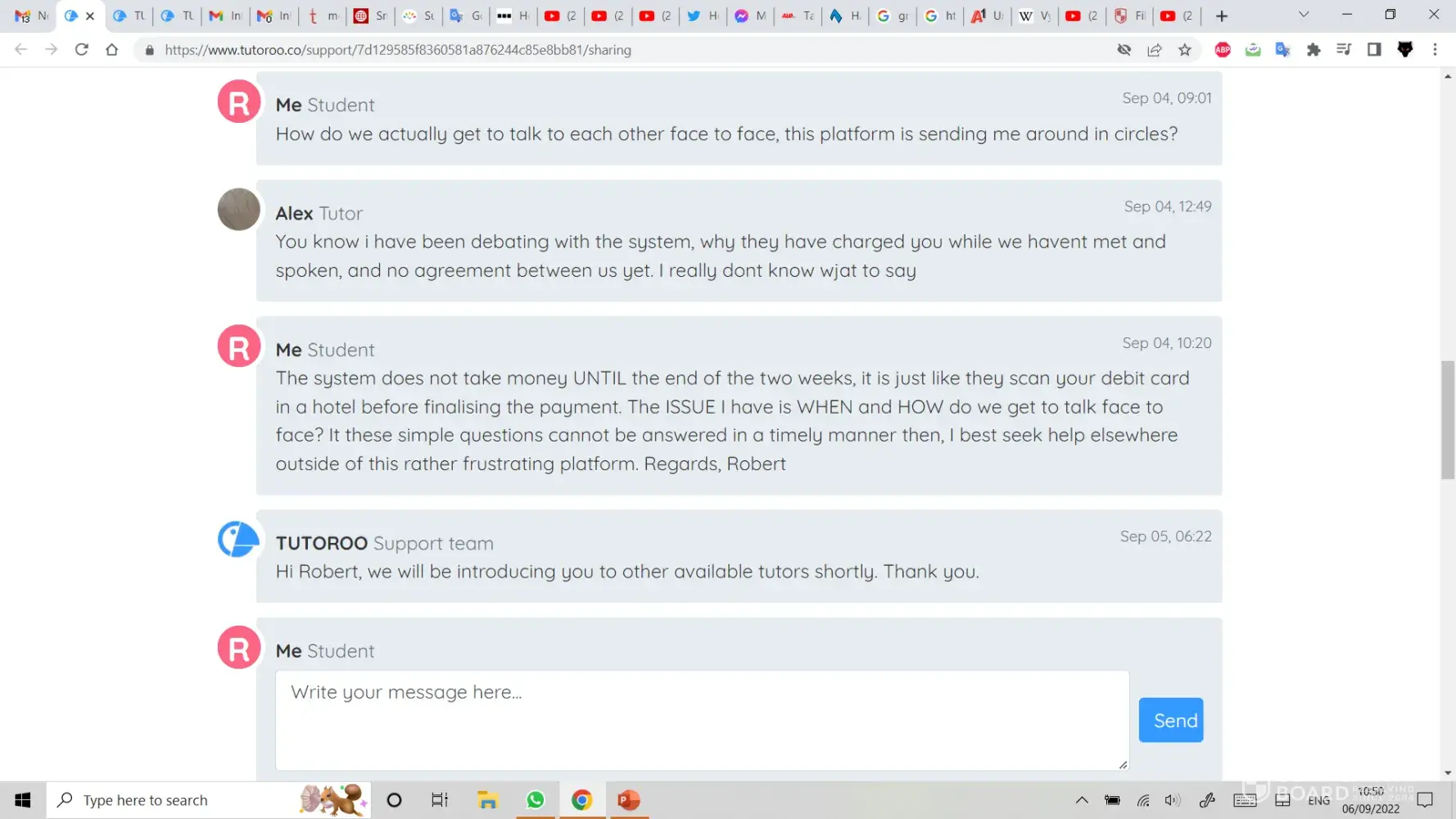 Your Tutoroo Team insist on not responding to my email sent direct to Finance team and insist on messaging me via the new Tutor messaging service. My query has nothing to do with the new Tutor and it is very unprofessional to drag her into this.