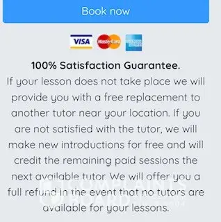 I have bought lessons in advance from Tutoroo, paid $120 and contacted the two tutors in my area from their website. Those Tutors did not respond, I have since been sent contact details for a further 4 tutors, completely not in my area, where I would have to travel 1 to 2 hours by car to meet them, I have then been asked to meet them half way in a library and complete my face to face lessons online (the reason I chose this company is because I need in person lessons). On their site it says if a tutor cannot be found they will offer a 100% money back guarantee = when I mention this they change the subject and tell me i "have to wait and contact another tutor) - This model is a scam, I am getting nowhere and need to warn anyone else to be ware!