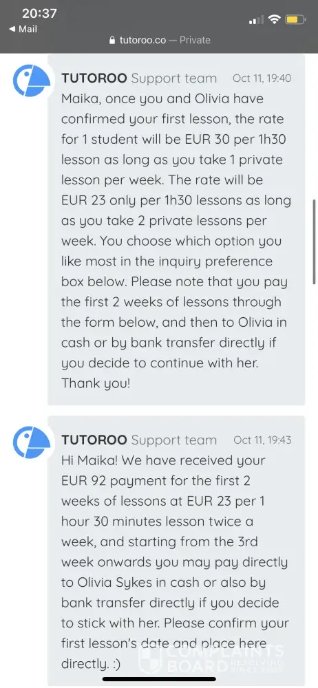 I payed 96euro for 4 lessons of 1hr30min and have not received any tutors or refund, I am hugely disappointed and frustrated with this website after numerous efforts to get my money back. Tutoroo makes no effort to give you the service of the tutor and you are the one doing all the work of trying to find someone. I would like a full refund ASAP. I'm done with this website.
