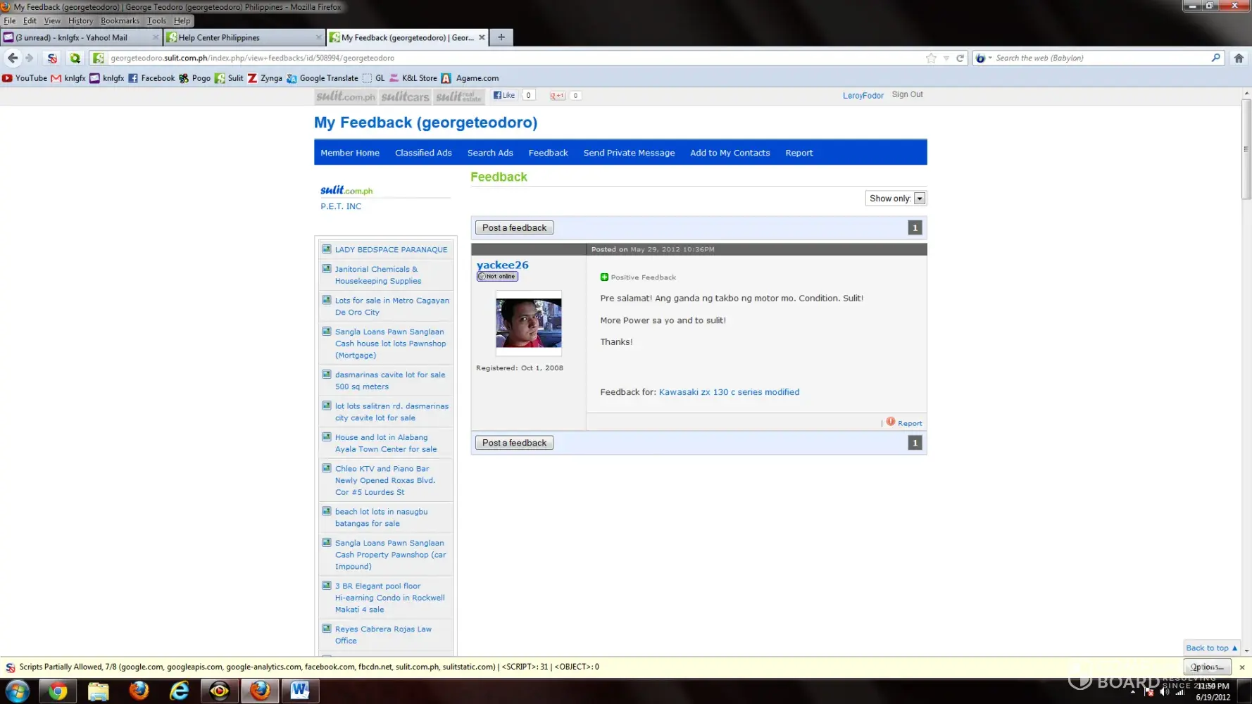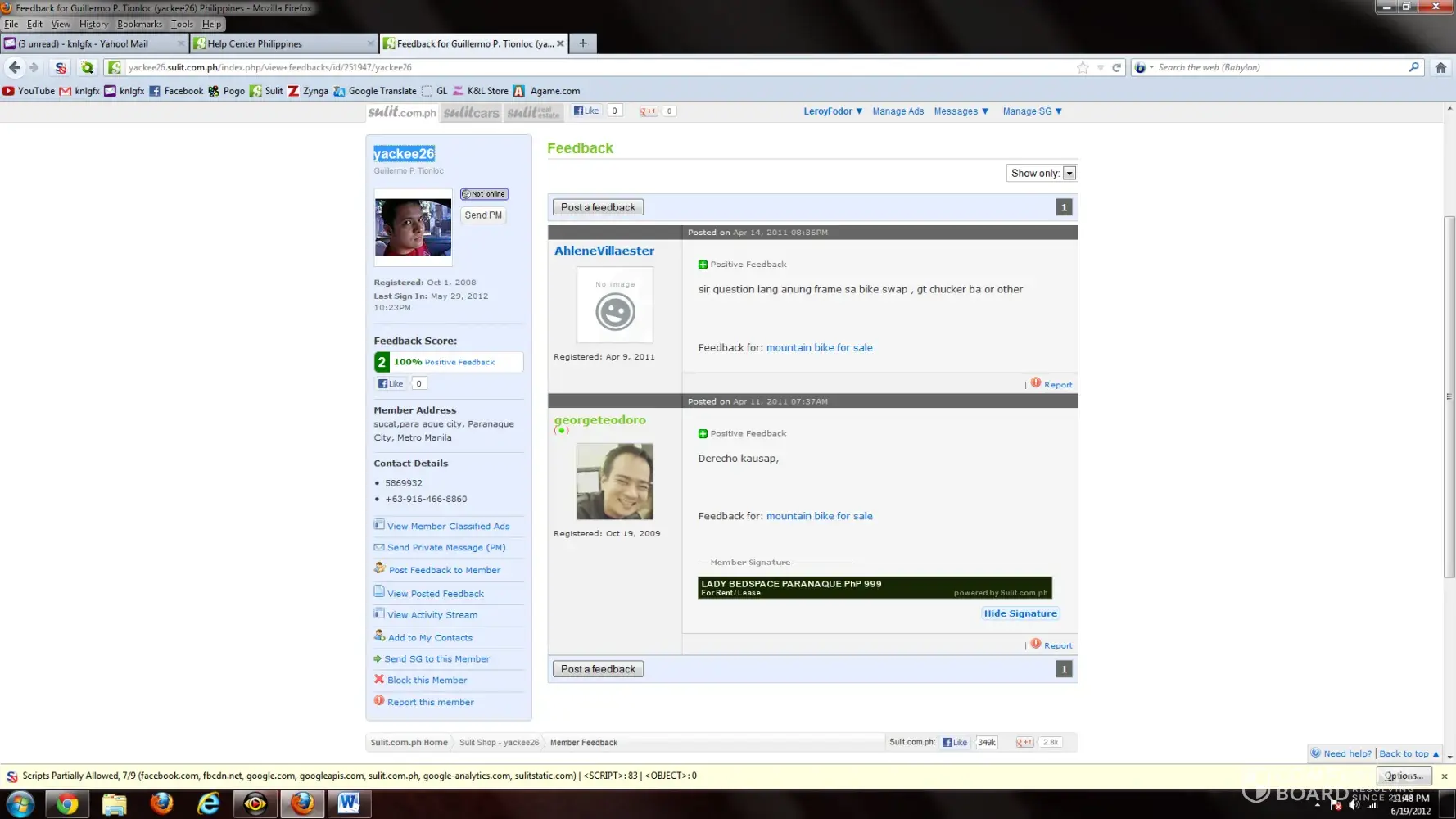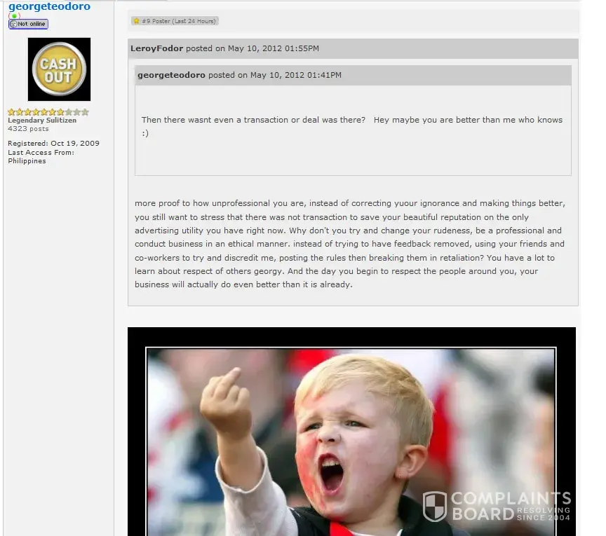 The response of Sulit support team is horrible. Here is where someone did the less to an admin than george teodoro has done to a few members and their account instantly suspended, Please keep in mind George Teodoro did these same actions against me and other members and did not get suspended.Sulit has also allowed this member to use stolen copyrighted images and post them on their forum, Posting private personal information about other users on their forum, he has been reported for solicitation scams, reported by more than one member for his multiple accounts, and abuse of feedback, and has multiple ads in many catagories, all of this are explicitly against sulit policy as per their rules.