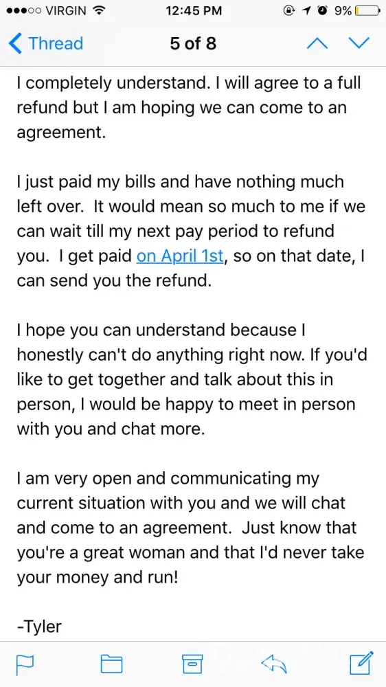 (Before you read and judge I want to inform you that some of the stuff that I did after January was all me and it was very stupid, it was mostly my fault but also very much Tyler's fault, I have a condition which makes me handicap and Tyler knew about it Very much and he took advantage of that and my money.. Now before you make assumptions please know that not only did he do this to me but he also to my close friend which her son is handicap as well. Tyler is not a nice person he acts like it but when your around him he's not, he hides behind his Christian Faith and dose wrong behind closed doors, I myself am Christian and what he's doing is not Christian what so ever, the word is getting out one way or another and karma works in mysterious ways, )