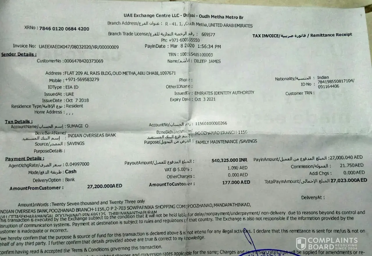 UAE Exchange invoice n° is UAEEXAERK002/[protected]/XR/[protected].