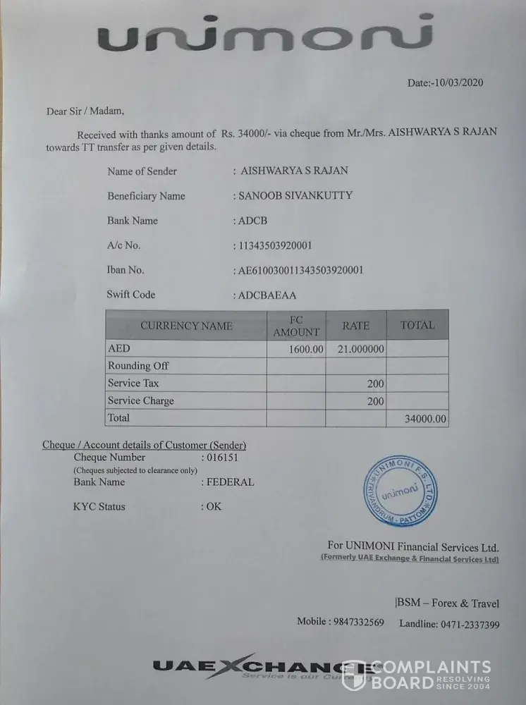 I transferred money in 2nd march 2020 using uae exchange web app using direct debit. But has not been transferred yet and every time they are coming up with news excuses. These people are spoiling the name of company brand value. I will highly recommend to not transfer money using uae exchange company. UAE central government should help us to get our money back at the earliest.