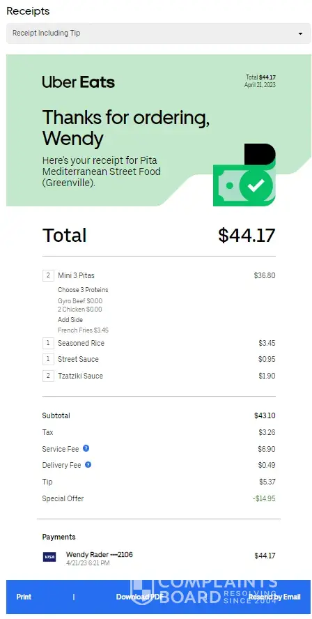 The restaurant charged more than the the listed price and then added an additional 6.90 service charge. The advertisement was buy one get one free. The price is listed as 14.95 and should have been 29.90. The restaurant charged 36.80 and deducted 14.95 (for the free meal). They advertised a.49 delivery fee and charged that an additional 6.90 service fee. No where on the site and when I checked out was an additional service fee mentioned. I feel completely ripped off. Uber Eats customer support acknowledged that I had been mischarged, but the agent said that there was nothing they could do. That the (mis) charges were valid even though she had just said that I was overcharged.