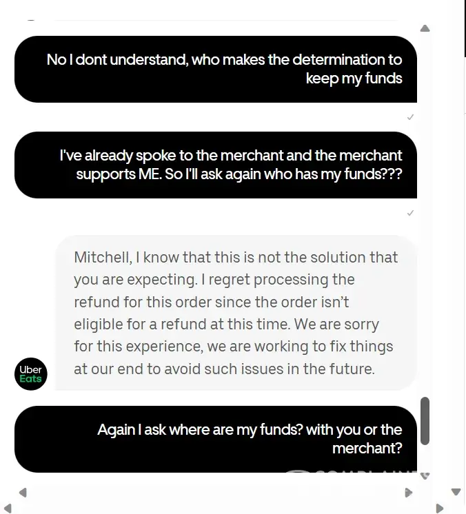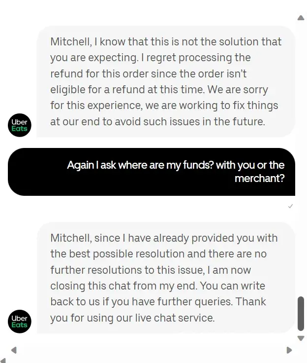 Desired outcome: If u pay for services that you do not receive you should in fact be refunded, Uber eats keeps the money and does not render service period