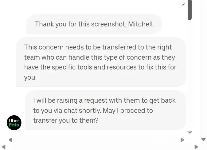 After multiple attempts, one of your customer service agents informed me that the transaction doesn't reflect on the system and that I would be transferred to another department to address the issue. She said I will be receiving a follow up email regarding the issue. However, I never received an email or call regarding the matter. While drafting this email, I attempted to locate the chat on my UberEats app, but was unable to find it.