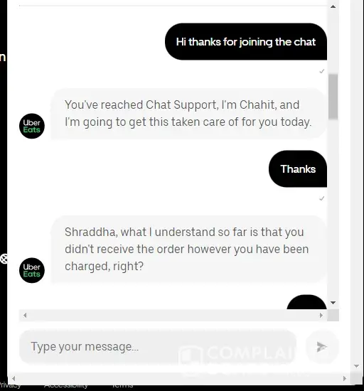 Desired outcome: I would like a refund or a credit to my uber eats account