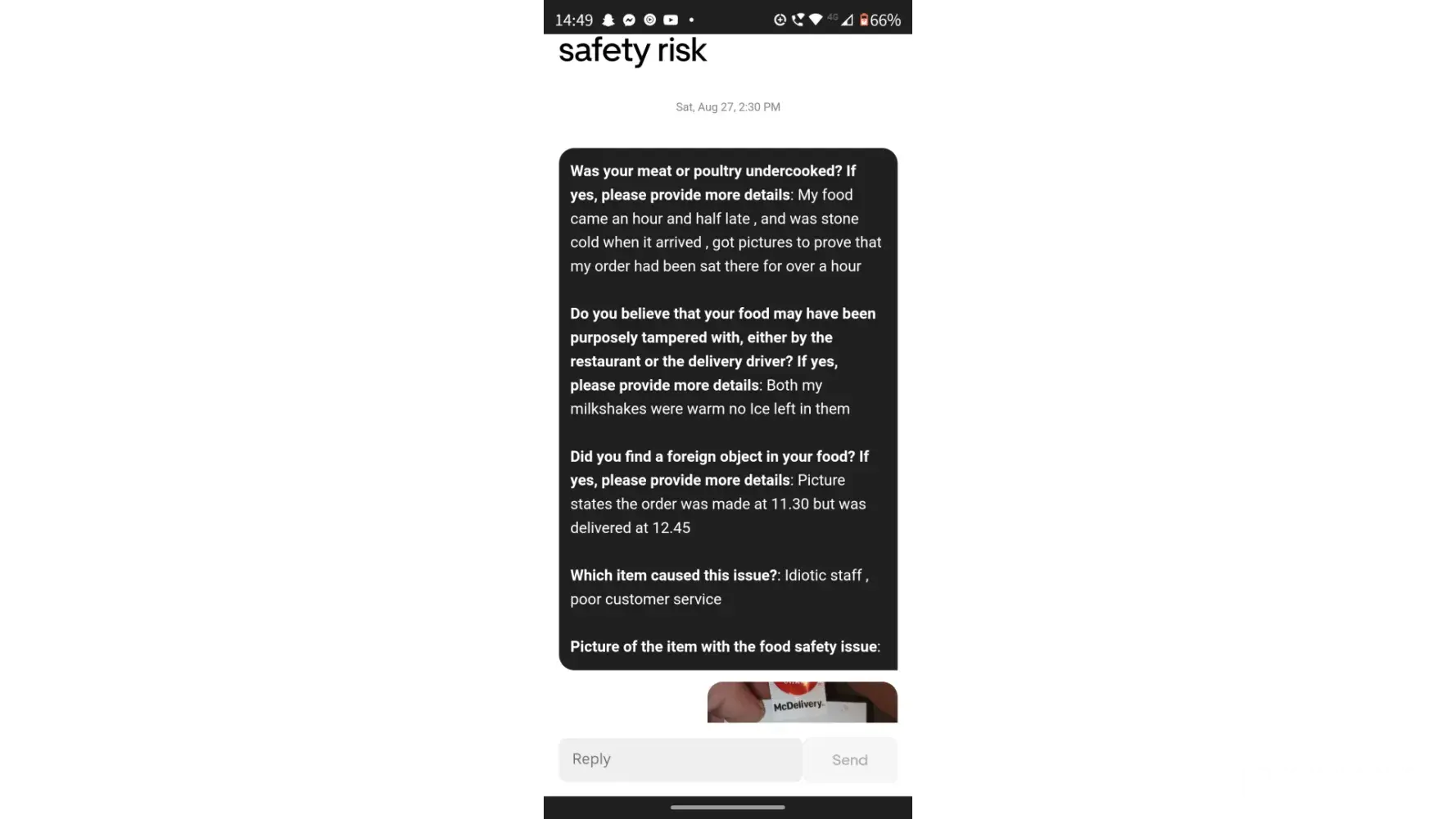 All screen shots prove my cold food! And being more than 2 hours late!!!
