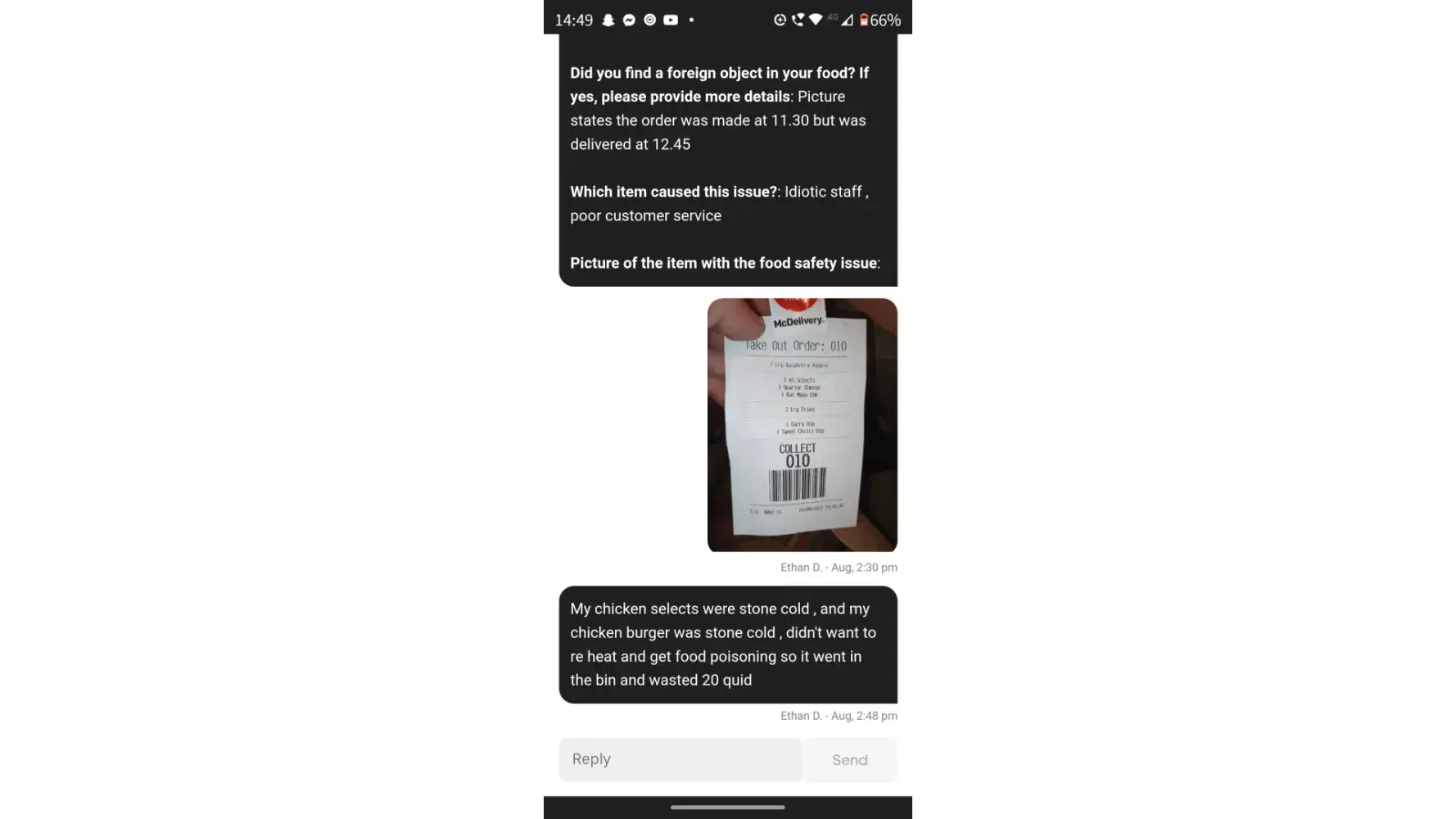 So I order McDonald's around 11pm, it tells me it'll be ready for 11.40, delivery picks it up then puts it down then delivery driver changes like twice nearly 3 times! I've got screenshots of my messages with the Uber eats delivery driver, that this restaurant is under staffed and run by idiots, and my order got thrown to back of the line freezing cold not even put under heat lamp! When my food finally arrives at 12.45 absolutely freezing and the drinks all melted no ice in them just warm milkshake, and I just asked for a refund and it's not possible! Are you joking right now! I'll be taking this too court this is like the 10th this has happened in like 3 months! I expect a refund! You gave me cold food, which I couldnt reheat cuz it's chicken! 40 quid down and no [censored]ing food! Uber eats sort it out!