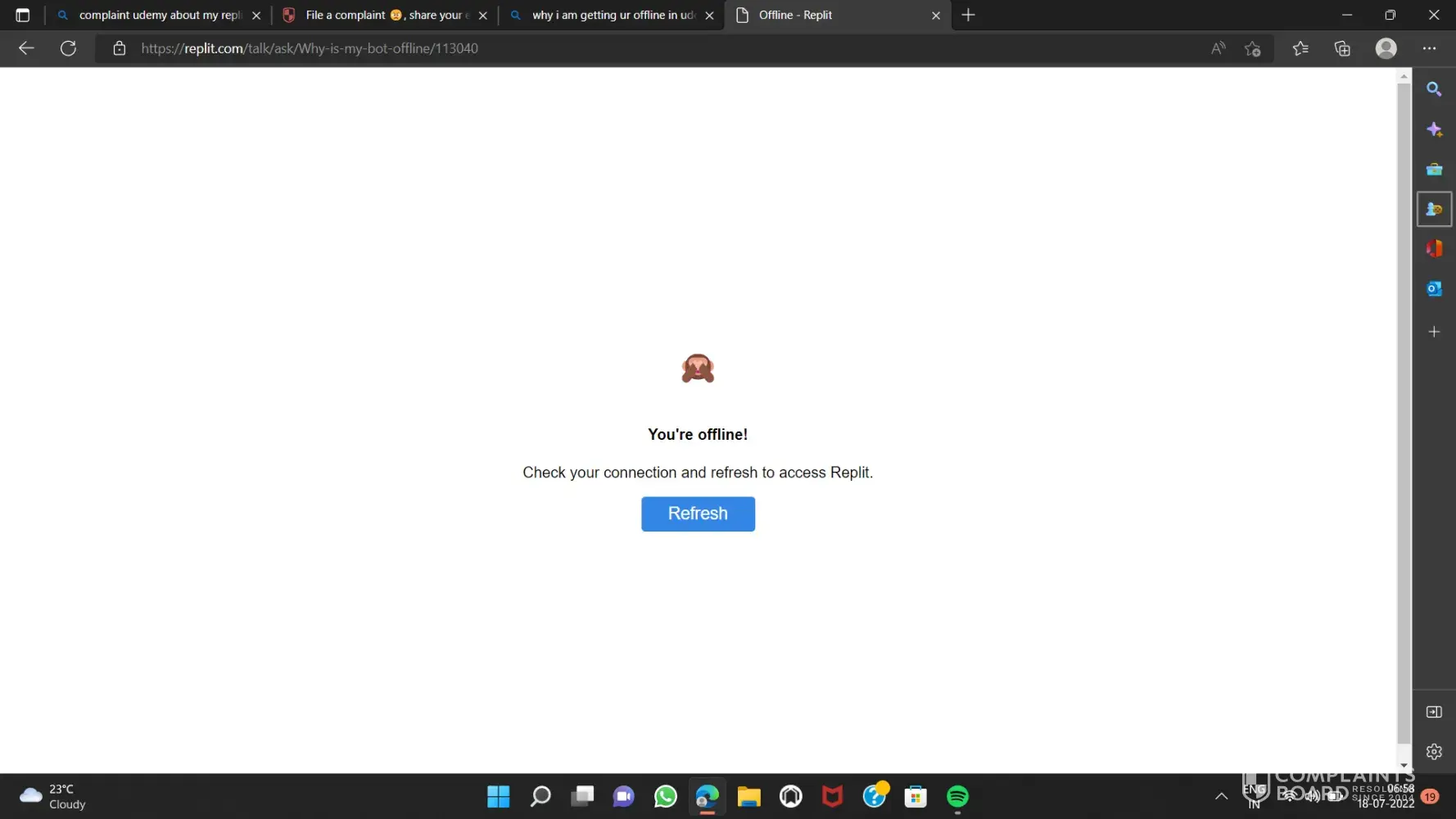 i am actually using internet and when i am viewing the course it's working fine but when i open repl for forking the program its showing im offline suddenly but my internet is working fine