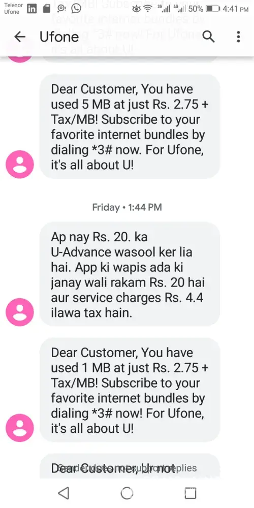 I know it's not just me, how do they get away with it? It's surprising even when you call the customer support agent, which btw they're charging you for and he throws some generic script at you, that you are some imbecile and don't know anything about using cell phones and Your apps are just consuming data. Thanks ufone support agent person, for landing a job that basically requires nothing but to lie and [censored] immensely because that's the Pakistani way