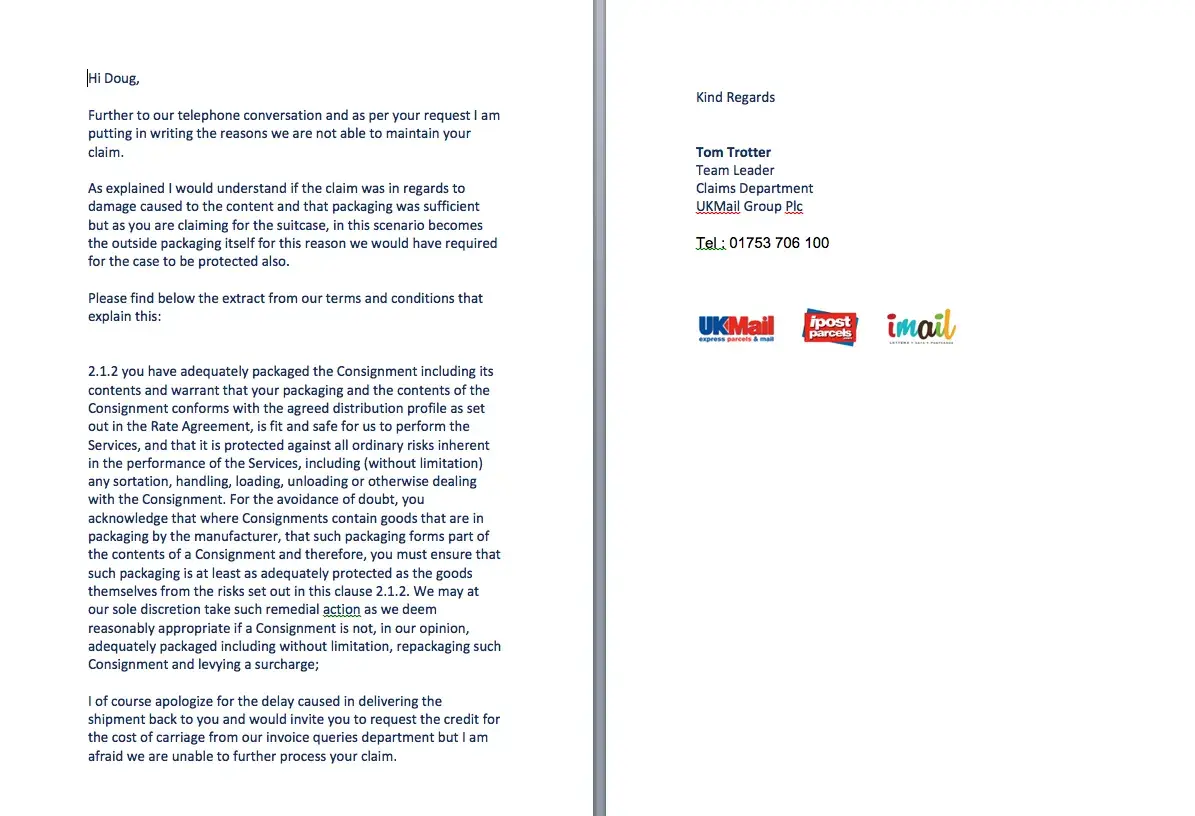 A suitcase had been left in a hotel in York accidentally - after contacting UK Mail to collect on a Monday they advised to check it was locked and stick a label on outside. After contacting hotel this was done and case should have been returned Tuesday. This never happened but eventually was reunited with case and contents 1 week later only to find case was damaged and lock system on Samsonite case and zip was broken. I followed the complaints procedure along with emails and numerous forms, only to find out that complaint and claim was not being upheld due to "Insufficient Packaging" (not once was I advised that needed to box or wrap etc, after all its a suitcase! UK Mail are definitely the worst company I have ever dealt with and to be treated in such a manor is amazing. The suitcase has been overseas a number of times and baggage handlers are not the best but has survived every trip except UK Mail from York to Slough! Never claimed for anything inside case as these were checked and all accounted and worked - wish I had now!. I have no case and to replace will cost £190 - Thanks UK Mail - you are the worst company I know.