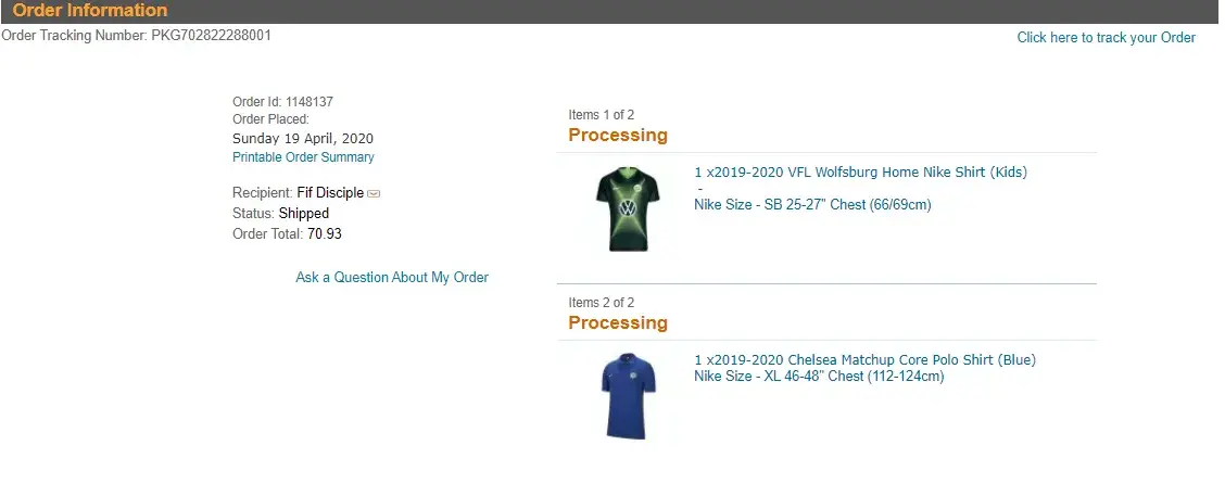 Ordered a full celtic home kit shirt socks and shorts paid by Visa card For scottish frinds son who is Austin but loves his football he is 19 on 27th December. Disgrace.Anyone else had problems contact me on fisherjulian23@gmail.com. I will report them to trading standards shut them down. £111 pounds out of pocket at moment and I paid shipping postage.