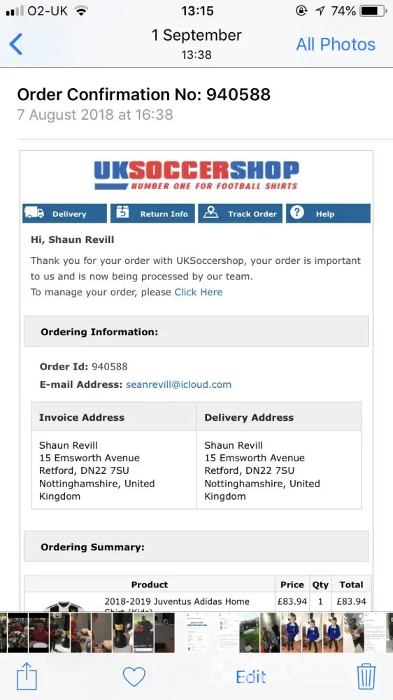 I ordered the full juventus 3rd kit online at UK soccer shop on the 11/10/18, it was for my son's birthday on the 19/10. When ordering it, it never stated that they didn't have it in stock. When I checked on my order it said it was a pre order so I emailed them and they got back to me saying it would be in within the next 2 weeks. I waited and then emailed them again and they said they had the shirt but no sock or shorts and I would have to wait another week. I've since emailed them 3/4 times asking for a refund and have had no response. Today the shirt came, with no shorts of socks. I had it printed and they printed it with a small name and a large number, it looks ridiculous. I paid £120 including posting. I'm absolutely livid!