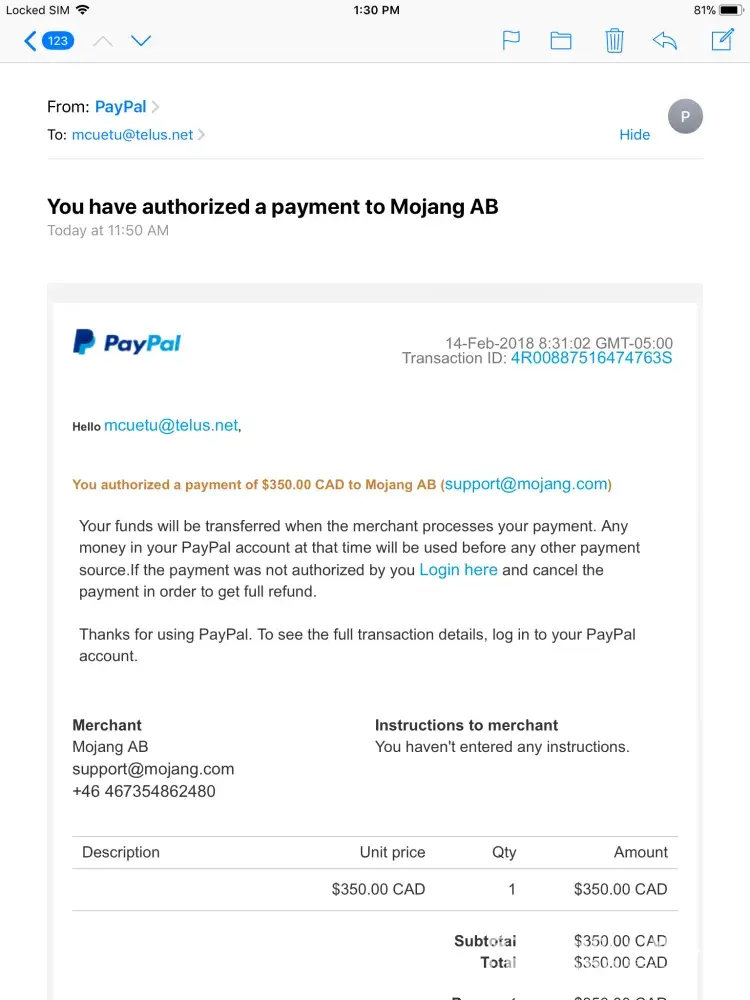 I have received an email from PayPal detailing a transaction I supposedly have completed on February 14, 2018. When I have verified my PayPal account I could not find any record of this transaction. I did not buy anything from Mojang AB and I consider this as an attempt to hack my PayPal account. In the received mail there is a login link that opens a login...