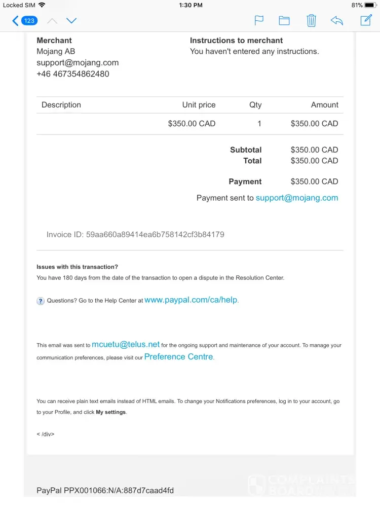 Read full complaint and 5 commentsMojang AB - paypal transaction