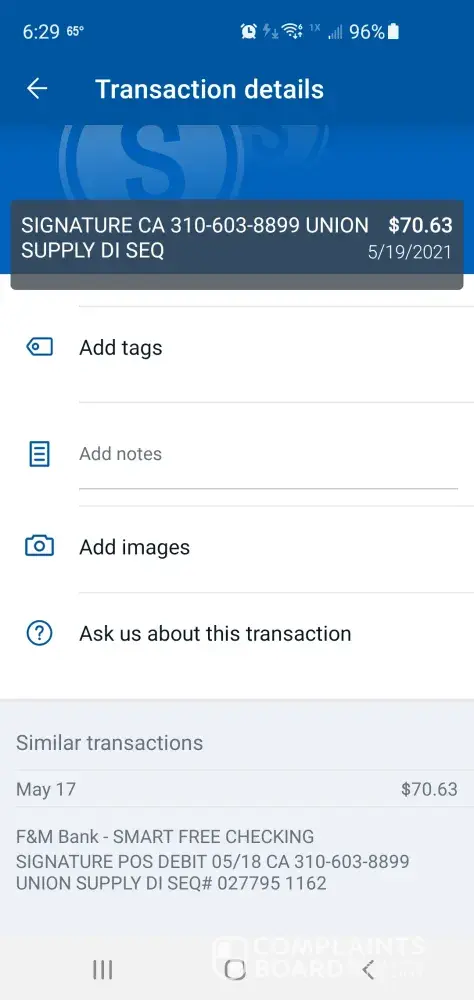 My debit card was charged $53.95, $50.00 for the deposit and $3.95. for the fee. I have a statement from the debit card account showing that amount was deducted and paid to Union Supply.