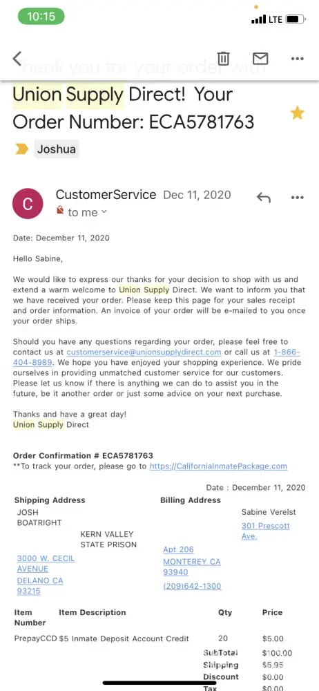 My son is in a state prison in CA. I ordered a package for him (Order # ECA5827178) from Union Supply Direct on 1/28/21. The next day I checked the status on the package and the message said it was on hold and that I should call customer service. Since 2/1/21, I have emailed both their customer service addresses 6 times and have received no response. I called both their customer service numbers at least 20 times this month, and every time I get put on hold; after over an hour waiting I hang up. I have tried the chat line and have gotten no response. Today I called company headquarters in both CA and TX and was put on the same hold line, and again I hung up after an hour. There is an issue of time here. If my son does not receive this package before 3/31/21, he will have been denied his state-authorized right to receive a package in the first quarter.