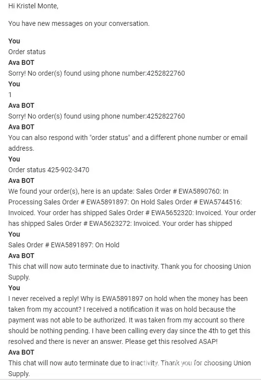 On March 15, 2021, my husband and I placed an order with Union Supply for our daughter. When I checked the status of the package, I got a message that the order was on hold and when I tried to track it the order was null and void. The money for it came out of our account and when I tried to reach customer service, I was unable to reach a person and the chat bot was no help