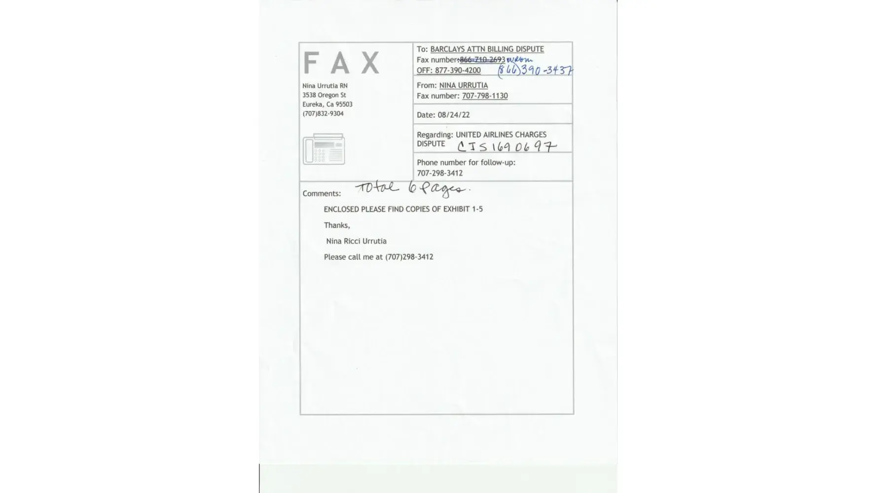United Airlines Reimbursement for the charges outline above.