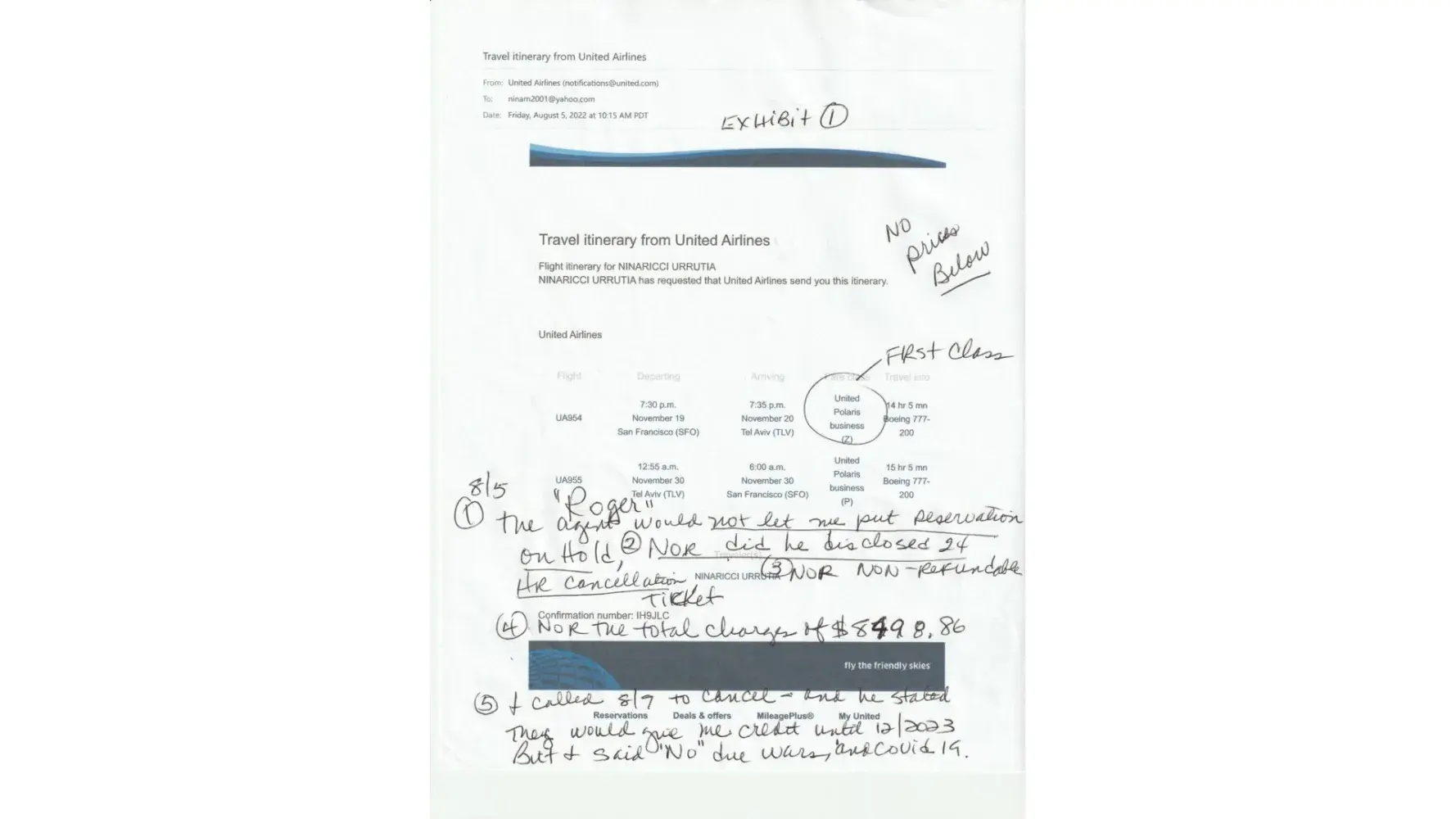 I have all documentations: Copy of tickets for both reservations, Charge to my credit card for the initial flight for $4,117.12 from United Airline and United Airline Changes/Cancellations from the etickets and from United website: