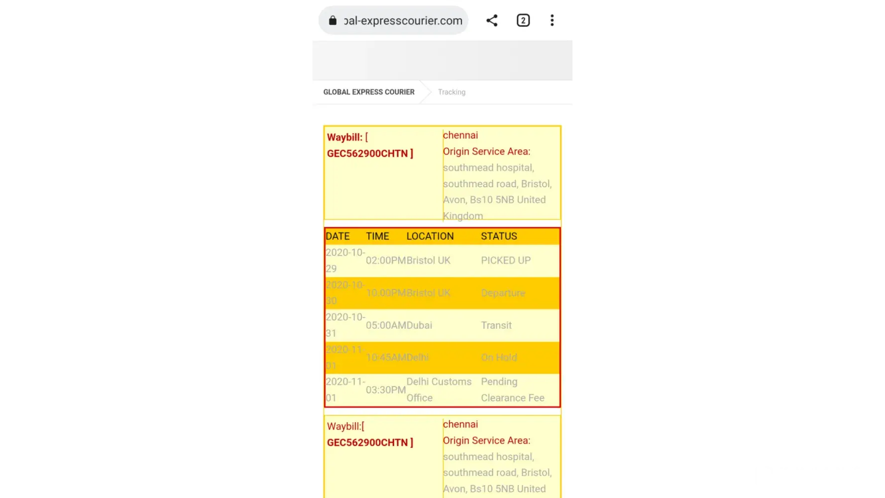 Dear sir, good morning, I am Jayaraj from Chennai, India. One courier company name global express courier, this company residing at 411,brisbane street, Houston, Texas. Send one courier parcel in my name but when I ask him to send HAWD number and parcel tracking I'd number, they ask me to deposit 1,30,000/- to deposit in their personal company account. But when I asked to Delhi customs they said don't pay any amount to any personal account. Please anyone else kindly advise to that company to give HAWD Number