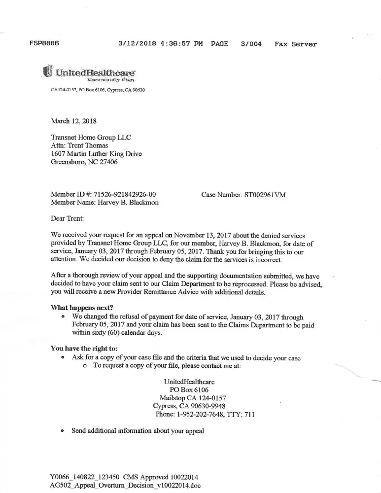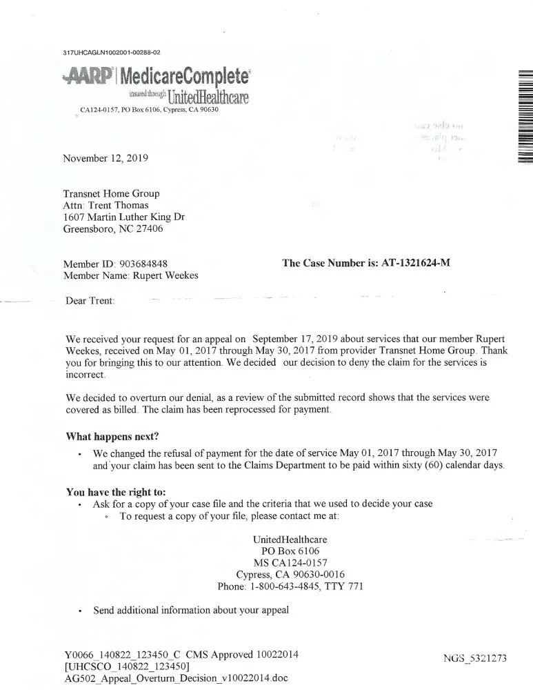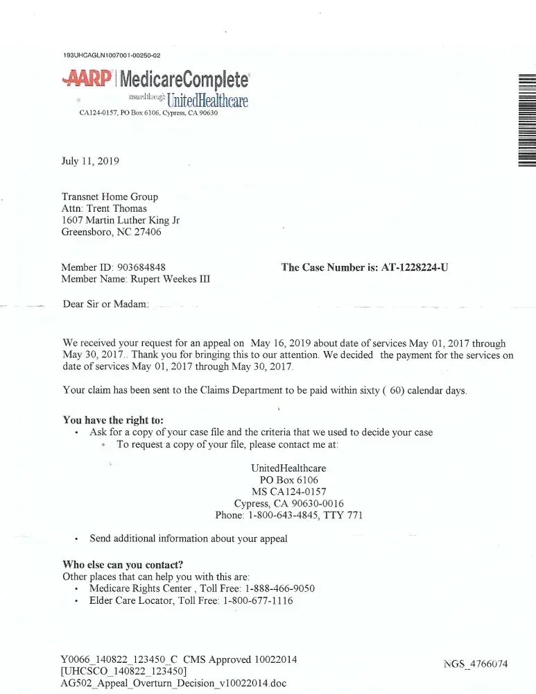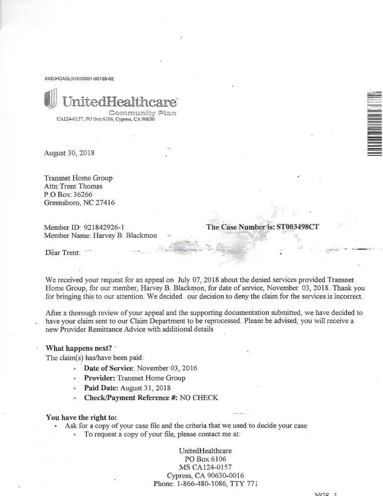 It has been over three years since services were provided and I am still awaiting payment even after several appeals overturning the original denial and promising payment within 60 days its been over 6 months since receiving these letters and still no payment. When I call I get consistently transferred over and over. I then get sent to another appeals process even though one was successfully completed on the exact same claims and again letters promising to pay within 60 days with no payment. I have all the letters from uhc with corresponding case numbers. My company name is Transnet Home Group business lic # [protected]. My name is Trent Thomas and I can be reached at [protected]