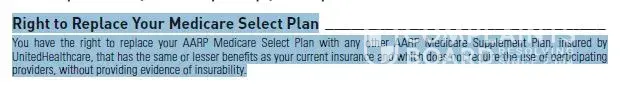 You have the right to replace your AARP Medicare Select Plan with any other AARP Medicare Supplement Plan, insured by UnitedHealthcare, that has the same or lesser benefits as your current insurance and which does not require the use of participating providers, without providing evidence of insurability."