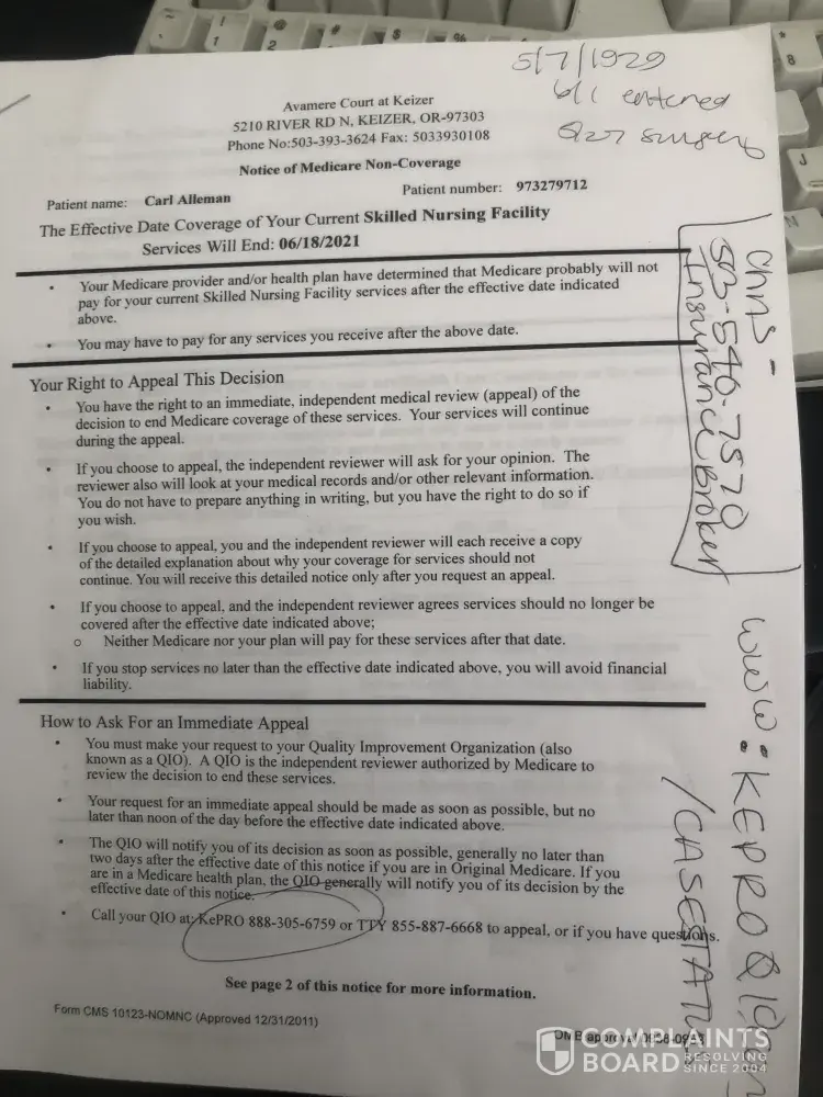 My 92 y/o dad feel and broke his R femur and his L ankle. Surgery was done on 5/27. On 6/1, he was admitted to Avamere Ct Keizer. In addition to his fractured legs he has Diabetes, Congestive Heart Failure, COPD and high BP. On June 18, it was determined he no longer qualified for skilled nursing and now we are having to pay $400/ day to keep in the facility since my 84 y/o mother is an able to transfer him, etc. The evidence of coverage states he gets 20 days skilled nursing (which he didn't get) and then copays s/b $184/a day.