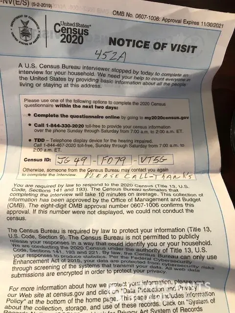 Since then we have had 2 census workers come to our house. The first one was satisfied with the fact that we had already been counted online.