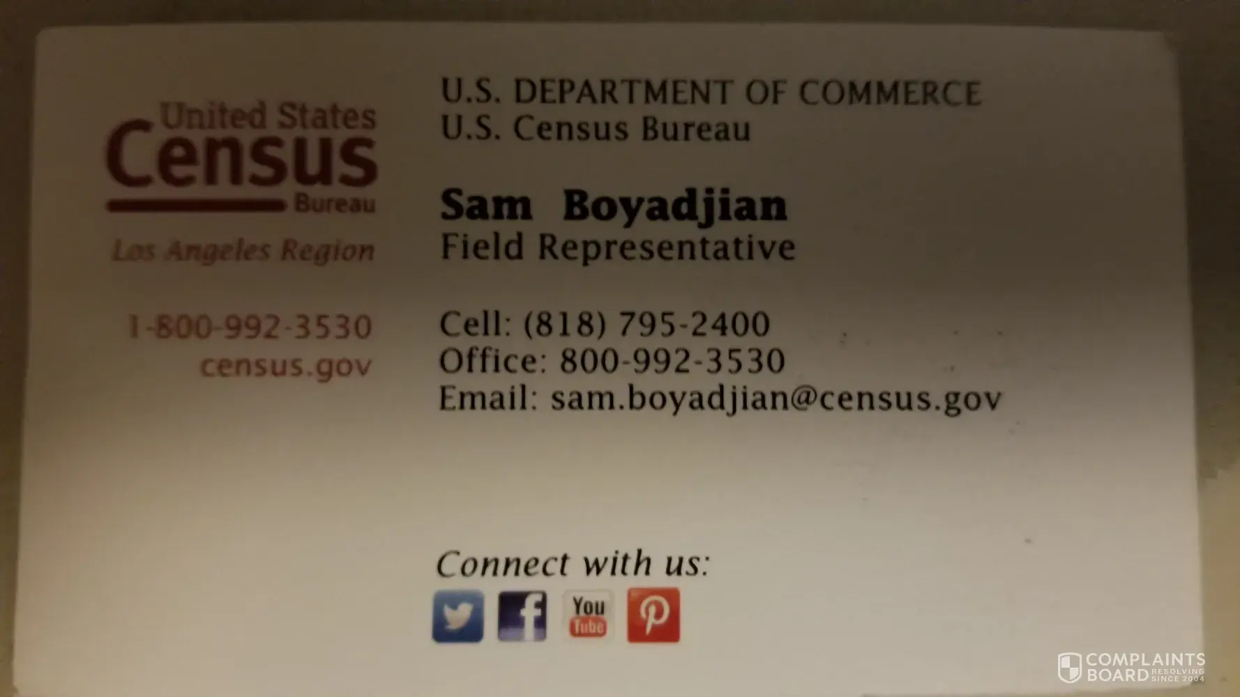 US Census Bureau Field Representives, Sam Boyadjian, trespassed into my property approximately 10 times. After advising him that Census will be done via internet or mail, he stubbornly comes into my property harassing my parents. Most recently he came into my property 8pm in the evening, spooking and disturbing, and adamant of his agenda. Do these guys get commission for each report. We will be calling the police.