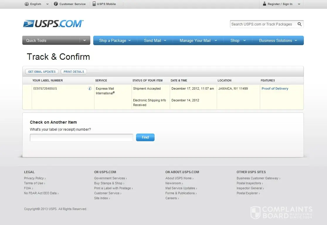 I chose the USPS expedited express carrier is worth U.S. $ 649 Apple phone 2012/12/14 rounds of the goods, today Beijing 2013/01/07, wait more than 20 days, the USPS official website is acceptancestatus of the goods to the USPS to now I have not received.I entrusted my sender the (zebra Company: Phone [protected] Address: 14547 155th St # H8932 City: Jamaica State: NY the Zip Code: 11434) bring my shipment receipt to USPS acceptance office consultation:the USPS staff reflect the goods still find registration records lost pieces。USPS official website query: 2012/12/17 cargo acceptance status in Jamaica.