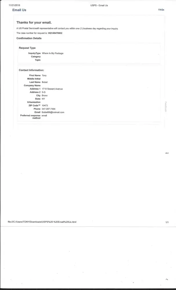 My Name is Tony Bobet from New York City . The main reason that i am filing an complaint. I suppose to received an package from the Post Office here in the Bronx. Its Clason Point Post Offices 1950 Lafayette Avenue, Bronx, New York City 10473. I suppose to receive an package. That i had monitor in the apps. i have file an complaint and i scan the complaint case number.