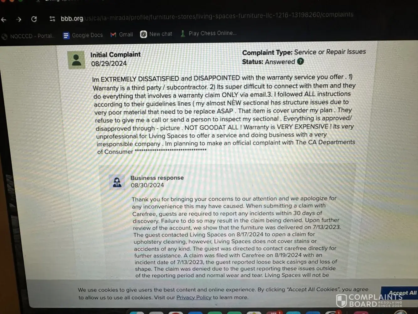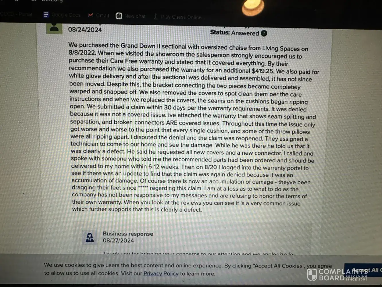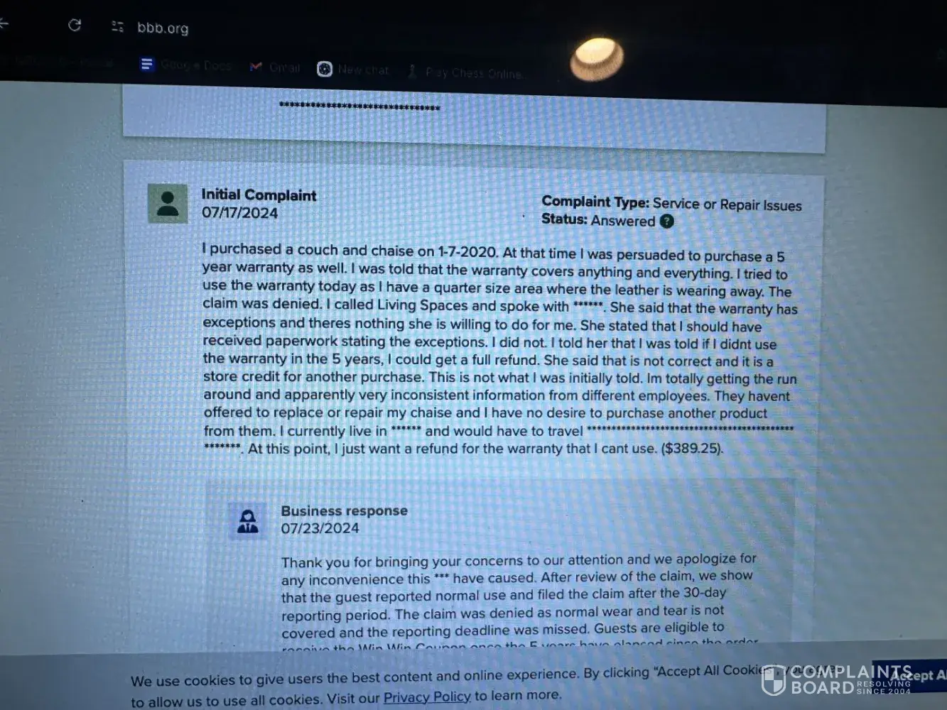 They denied the claim and the people at WarrantyServices were all but laughing at me an accusing me of fraud - you wrote this was the TRUTH, you didnt report the issue fast enough! If it was always there, how are we at fault! But I DIDN'T EVEN MENTION THE MAIN REASON WAS A BOARD FELL UNCONNECTED TO THIS ISSUE. Now they are literally laughing at me? And telling me they can keep my money? While laughing. This is EGREGIOUS behavior. I already contacted the Better Business Buereau about Living Spaces and am about to about this company too.