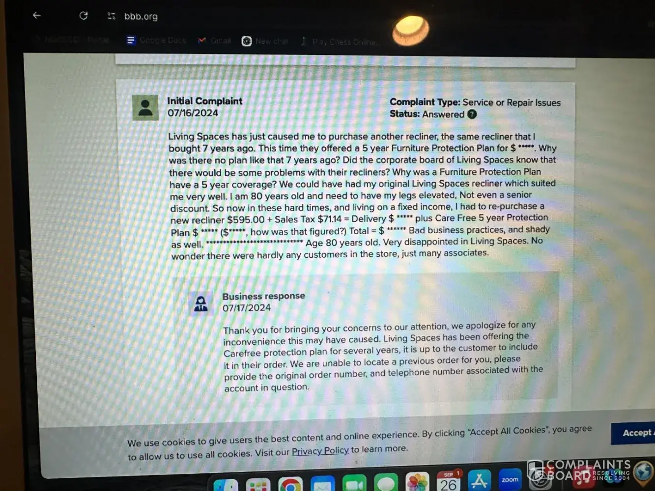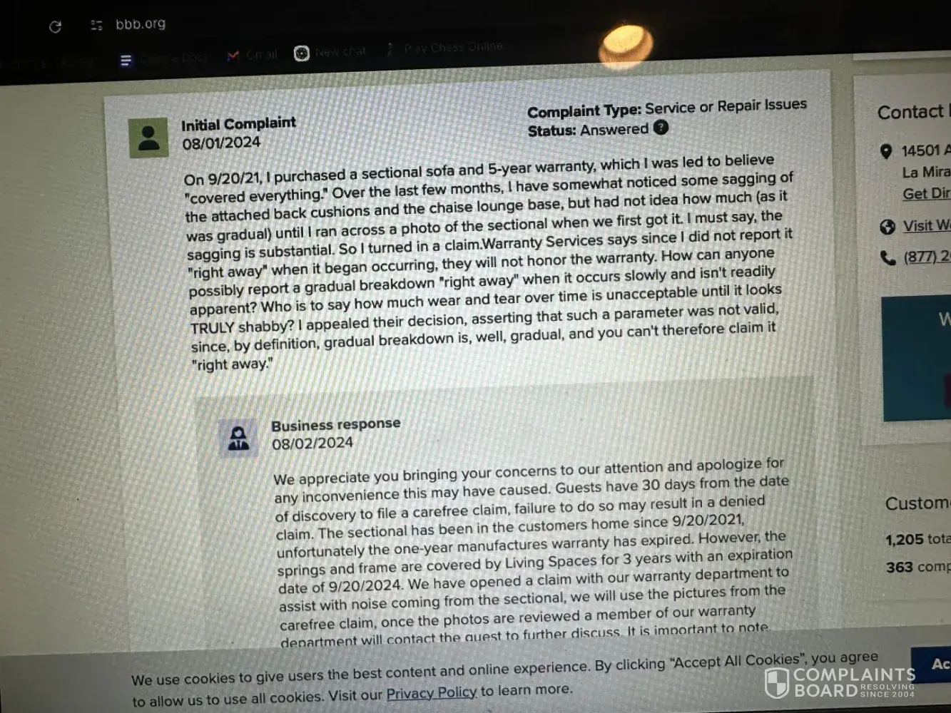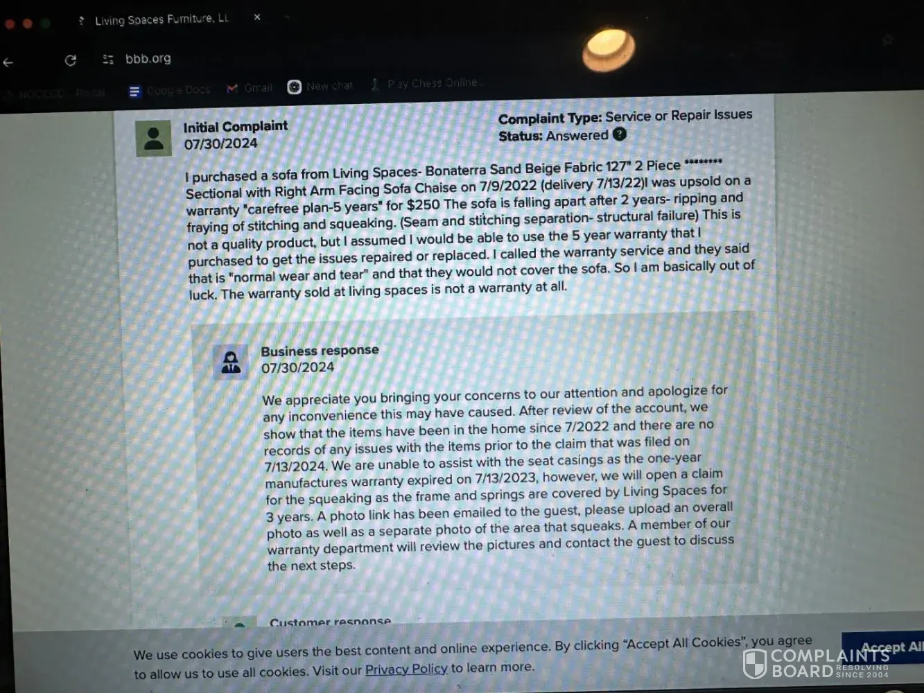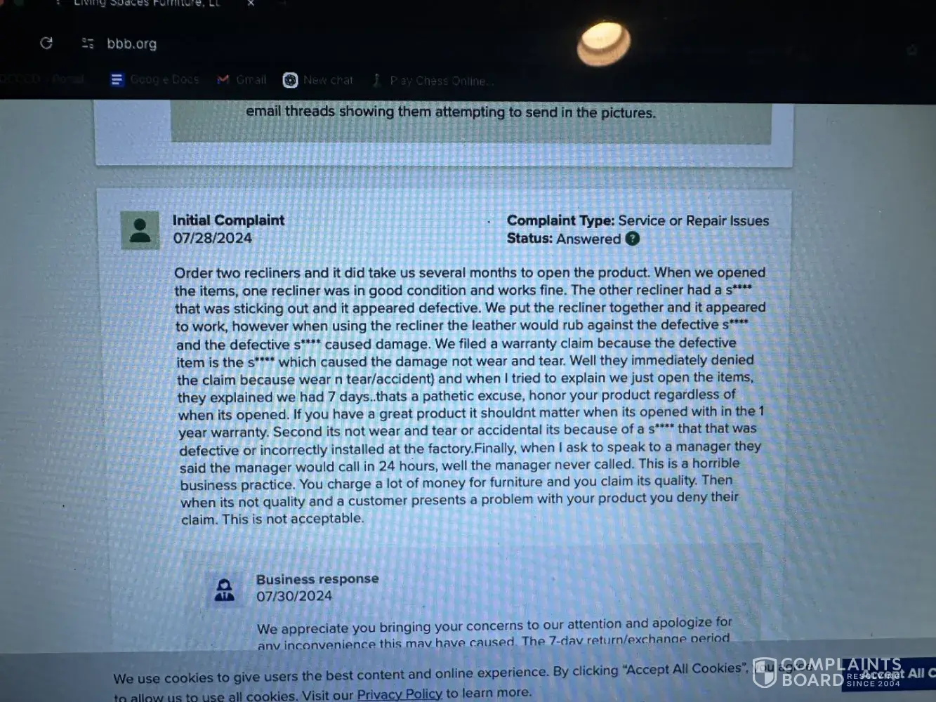 They denied the claim and the people at WarrantyServices were all but laughing at me an accusing me of fraud - you wrote this was the TRUTH, you didnt report the issue fast enough! If it was always there, how are we at fault! But I DIDN'T EVEN MENTION THE MAIN REASON WAS A BOARD FELL UNCONNECTED TO THIS ISSUE. Now they are literally laughing at me? And telling me they can keep my money? While laughing. This is EGREGIOUS behavior. I already contacted the Better Business Buereau about Living Spaces and am about to about this company too.