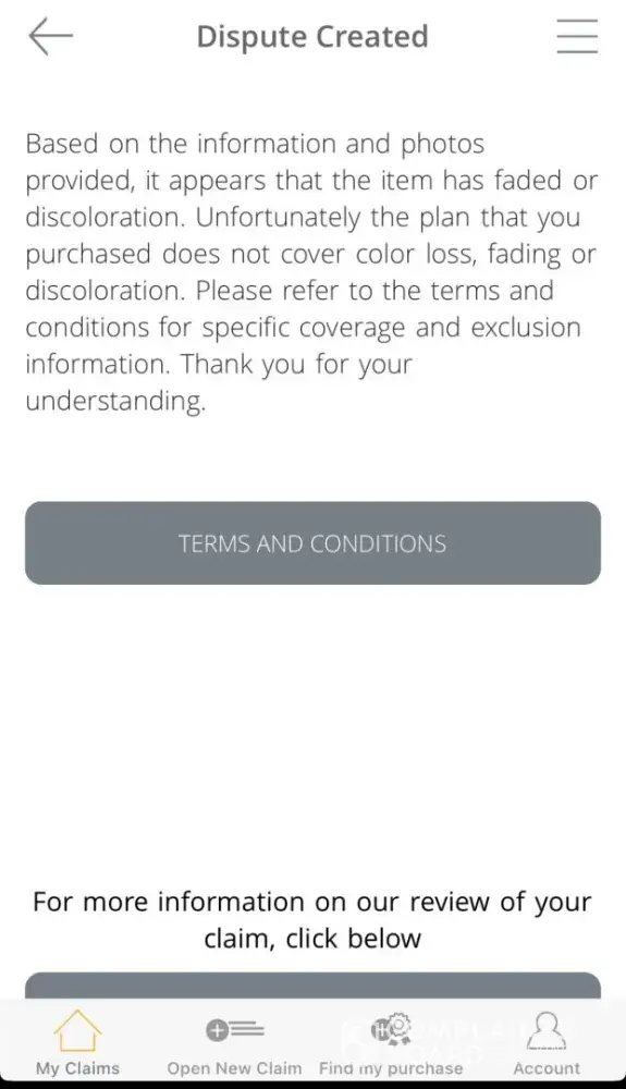 I responded to their decision with a dispute explaining again that this was a single incident with a scared pup emptying his bladder right onto the absorbent couch and that is all and should be covered by this warranty. I then got an email saying my dispute was received and I’d get a response within 30 days.