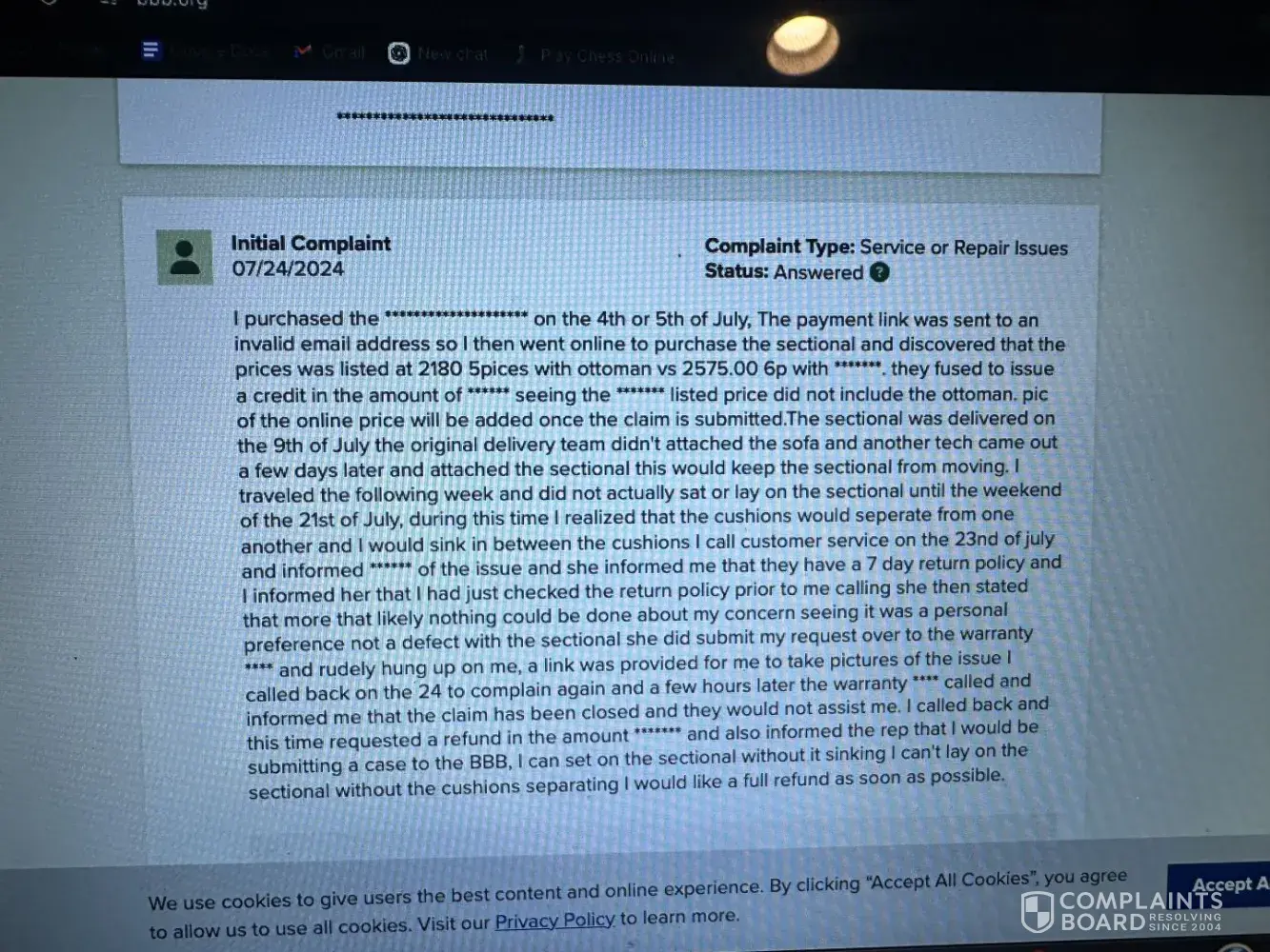 I tried for DAYS to get someone on the phone to come take a look at my couch which had a support beam fall lose the other day. After DAYS of getting the run around someone told me to take pictures and file online - I told them there was nothing to take a picture of, the issue was internal. They said it didn't matter what I said or took pictures of, that that was the only way to get anyone to return my call. So I whip out of my phone and briefly just answer the questions. I referenced the boards were lose when I got the board but didn't get a chance to mention something recently snapped or fell out of place - I only REFERENCED the issues could be connected.