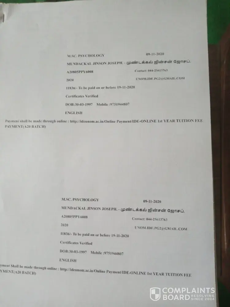 I passed MCA from IDE University of Madras in 2017 and downloaded marks sheet from the university website. I have passed all papers but till date not received consolidated marks sheet. I have paid the fees and self addressed envelope in the university campus but not received the marks sheet. After writing to the Director was assured of the marks sheet but till date received no marks sheet.