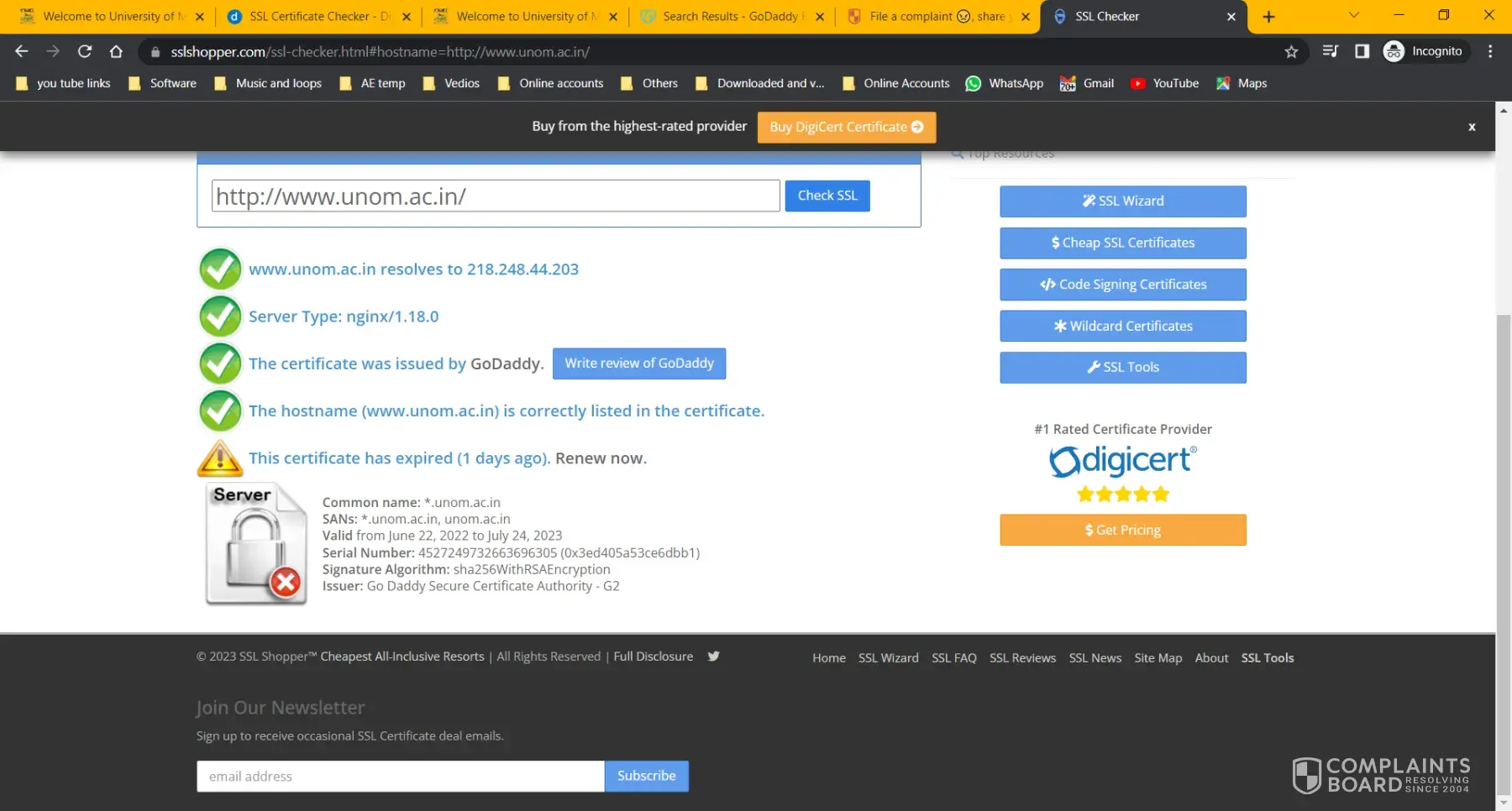 - We detected that unom.ac.in is missing an SSL certificate, which is a cause for concern. Without an SSL certificate, the website may not be taking adequate steps to protect users' sensitive information. This can increase the risk of intercepted data being used for malicious purposes.