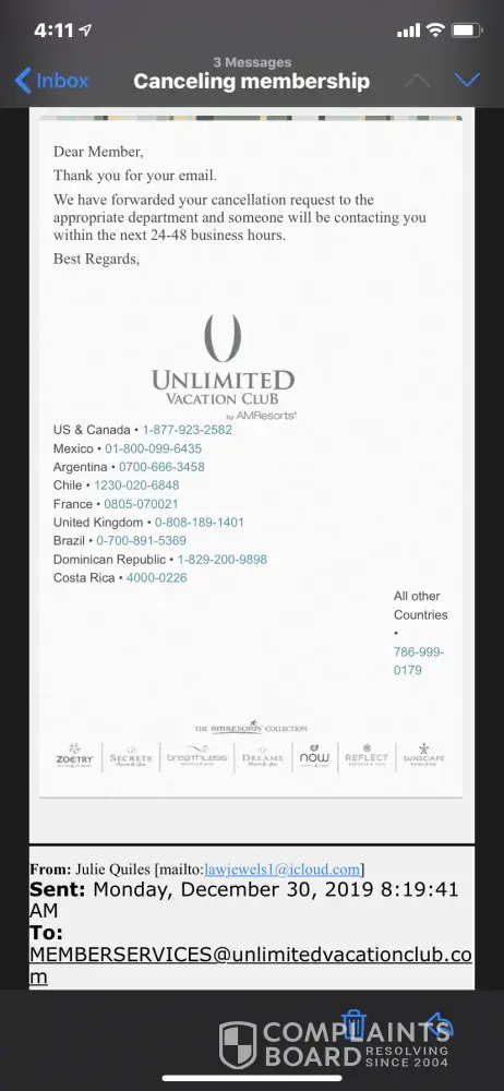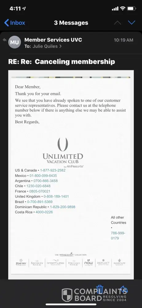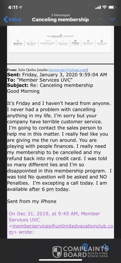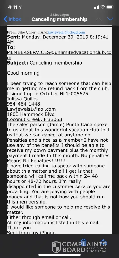 Sit I am happy to show everyone the 20 emails I have sent you since last Wednesday evening. You people do not respond. Yo are not going to tell anyone you have tried and couldn’t get a hold of me. I’m available. I just emailed you, at your provider address this morning again at 8:09 also last night at 6:15pm, yesterday at noon and yesterday morning at 8:15am. I can keep going on. Each email says I am available now and anytime along with a phone number and email address. If you can prove me to or anime here you tried to contact me in any fashion other than to collect money on a fake contract I’ll keep quiet. I am not in the wrong here, Unlimited vacation club is