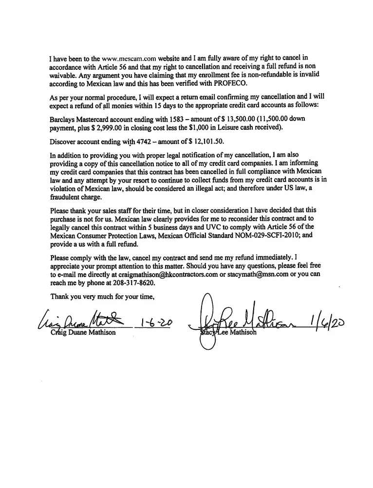 Per the contract and Mexican Law we have 5 business days following the date of the signing of this to cancel and request a full refund of the down payment.