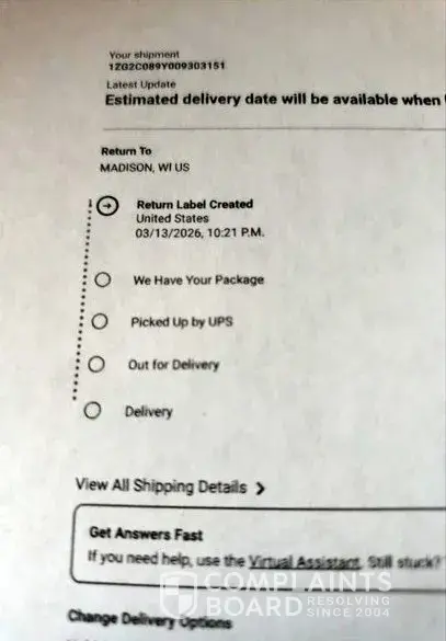 It says delivered with no picture showing that it was delivered to my house at all. It was supposed to be delivered on 3/18/26 and I have reach out to my company that I purchase my package from. Then I called UPS on the 3/18/26 and spoked to a rep and I was told that my package had the wrong address on it, but my order has my address on my package. I'm...