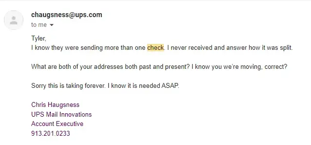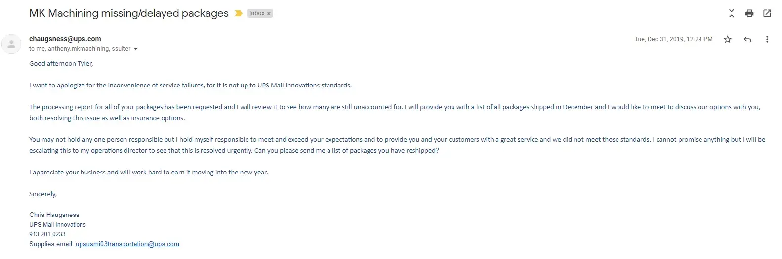 We received notification from UPS Mail Innovations that they were sending reimbursement checks, several times. These were "sent to the wrong address", and after many excuses they cut all contact just after the cutoff date for resolving missing packages.