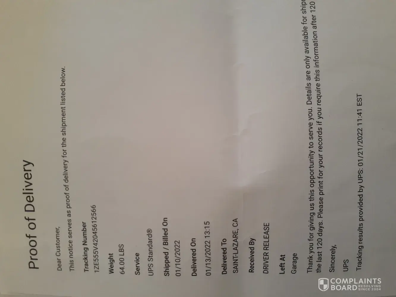 I ordered some flooring from COSTCO Canada. Two packages were shipped by UPS to me. The tracking number was 1ZE555V42045612566 It was supposedly delivered on January 13 2022 at 13:15 hours and left leaning on my garage door. I have a proof of delivery but no delivery was made. When I called UPS no one seemed to care and I was told to phone COSTCO for another replacement of the product that was supposedly delivered. If a driver supposedly left the box where is it? Nobody at UPS seems to care that a driver can say it was delivered and it was not so I would imagine lots of parcels go missing without a care by this company. In future if i have a choice of delivery companies UPS will not be my first choice