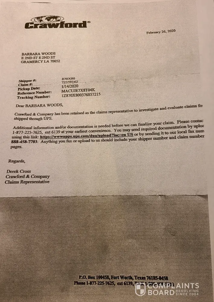 September 18, 2020, over 9 months of not getting any help of refund of my shipment from UPS Las Vegas to Barbara Woods Learning Academy, Gramercy, Louisiana, that was damaged and loss, according to UPS. I filed a demand letter to the Claim's Adjuster, assigned to this claim and their registered agent. Unfortunately, I was made aware that I needed to be...