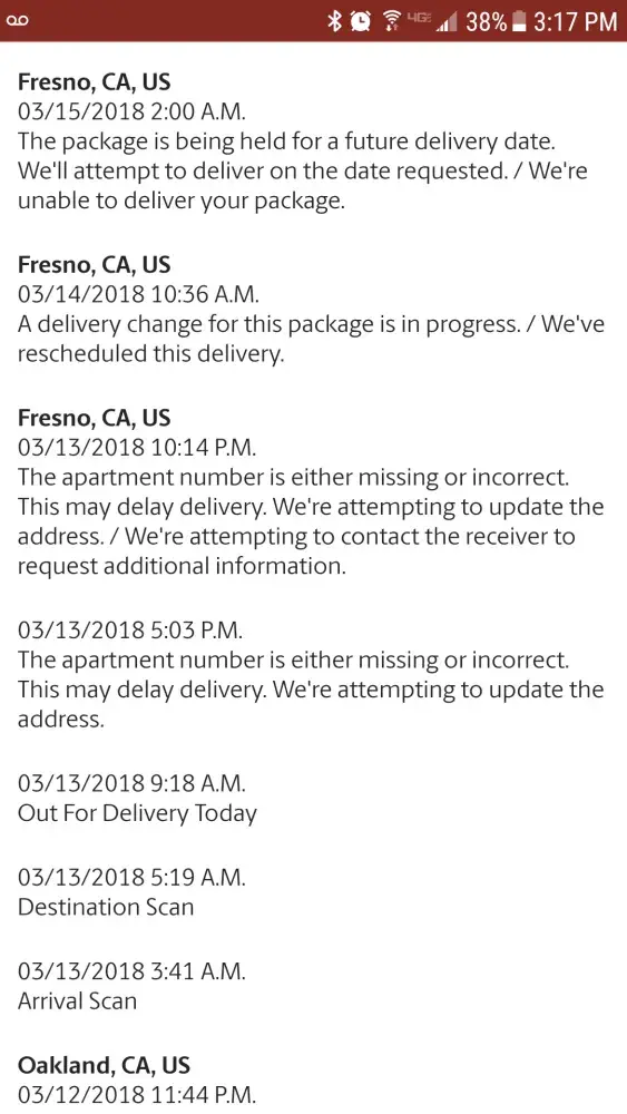 My package was supposed to be delivered on the 13th of March 2018 and was sent back to the facility because they stated it needed an apartment number. I confirmed to them no apartment number was needed. They said it would delivered on the 15th. Still no package. I called again, they said the same thing, needs an apartment number, after i had just called to tell them it doesn't need one because i do not have one. They connected me to the area supervisor in Fresno, CA. She said she would put it on the truck for delivery for the 16th. AGAIN, no package. She never updated my information to deliver to my address. I called again, today, the 16th, and they had the same lady call me today, the 16th. She told me it wasn't deliver because I didn't confirm it to be delivered or picked up. I specifically told her I was not picking it up and that the shipping to my address was already paid and it s their job to deliver. I told her she was rude and ask why was she messing with the delivery of my package and she hung up on me.