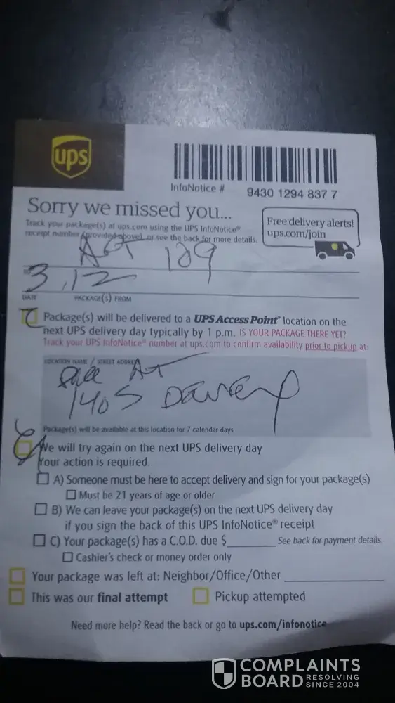 3/12- Driver left a missed call tag and my wife and I were home all day no buzzer was rung. See attached ticket indicating tried to deliver and my wife and I had to drive to get our package. Drive lied on ticket and also ticket is not filled out correctly. Called local terminal and spoke to Tracy or Theresa never got a return call as requested. I emailed [protected]@ups.com never heard back