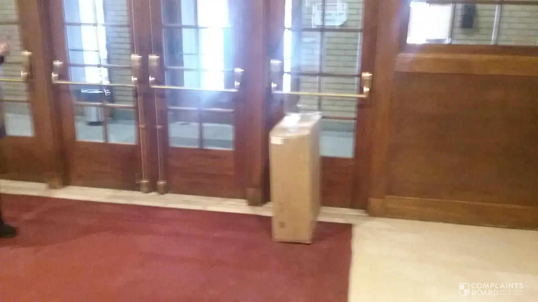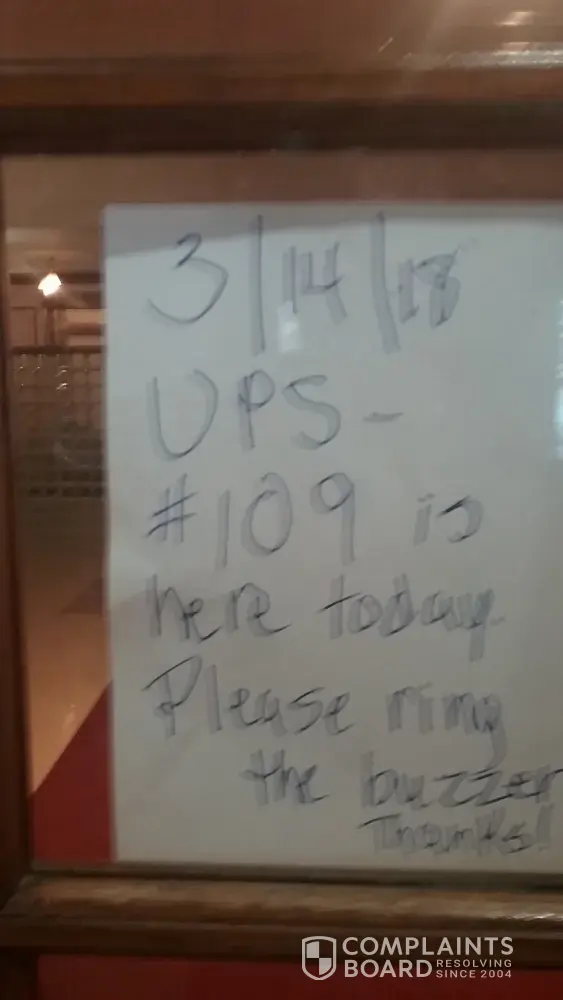 Driver rang alarm and we buzzed him in..I went to down to lobby to verify driver would not just leave it and complete the delivery to the door. Sure enough driver had open the lobby door and left package (See pic) in front of exit (against fire code) and left the box inn lobby vs coming to our door in our condo. UPS policy states direct delivery to the door address of unit is to be made. On going issue I need addressed [protected] my name is Don Root 409 LAgrange Ave #109 Rochester NY 14615.